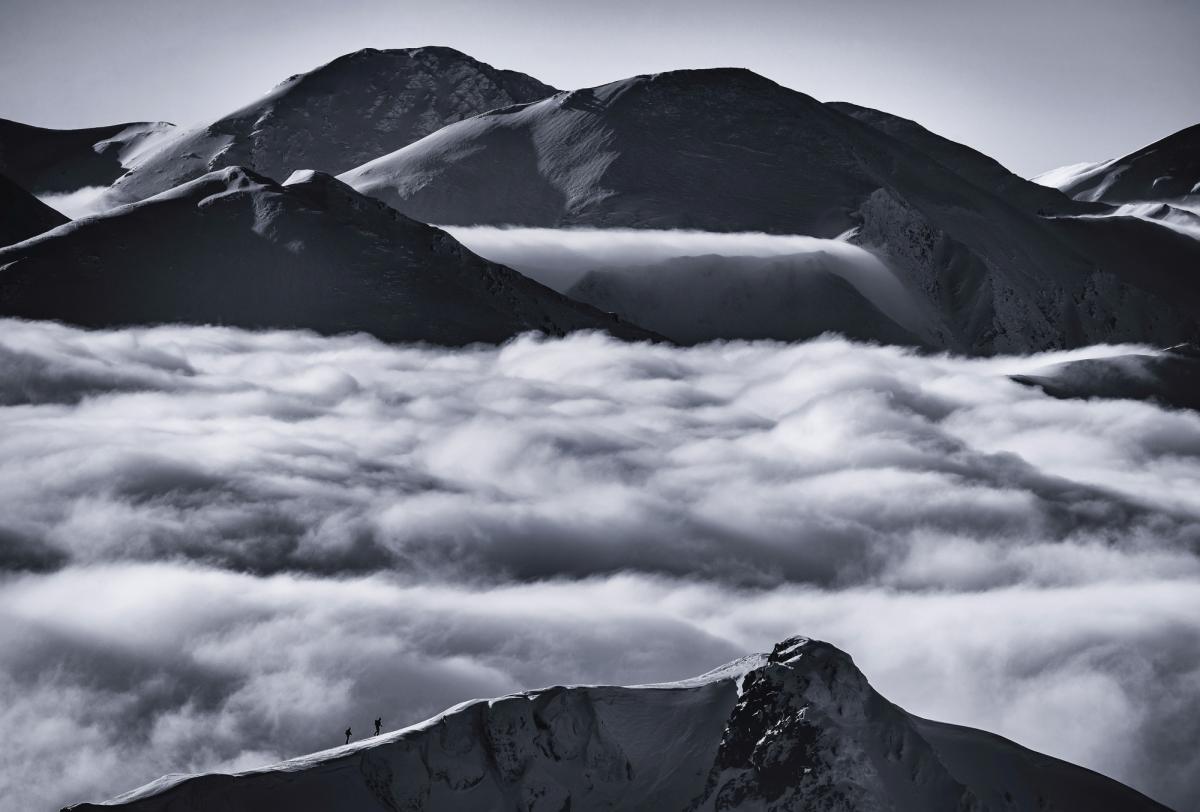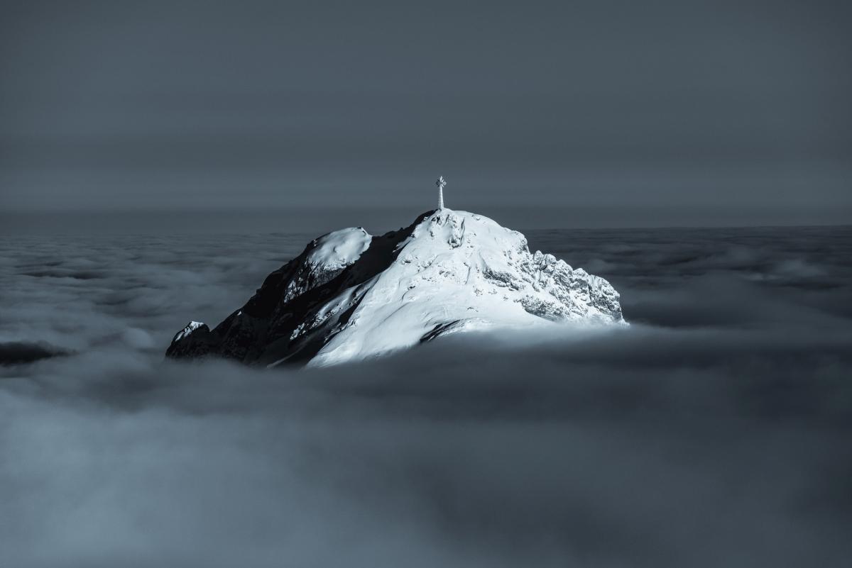 Drugi kadr to Giewont okryty kołderką. Tę górę wszyscy dobrze znają, lecz sztuką jest uchwycić ją w nietypowy sposób. To zdjęcie wykonałem z podejścia na Kopę Kondracką. Ale idąc do góry po cichu liczyłem na to, że na szczycie pogoda dopisze. I gdy dotarliśmy na wierzchołek, spektakl zaczął się na całego. Zobaczyłem Giewont otulony świeżo napadanym śniegiem i chmurami, które stworzyły spektakularny widok samotnej wyspy wyłaniającej się spośród morza obłoków.