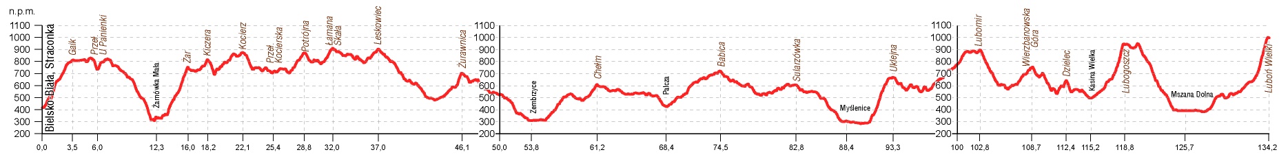 Schronisko PTTK na Kudłaczach - Uklejna - Myślenica - Pasmo Babicy - Chełm - Zembrzyce - ok. 45,4 km, czas: 13 h 20 min; suma podnoszenia: 1235 m, suma zejść: 1621 m; pasma: Beskid Wyspowy, Beskid Makowski, Pasma Pewelsko-Krzeszowskie