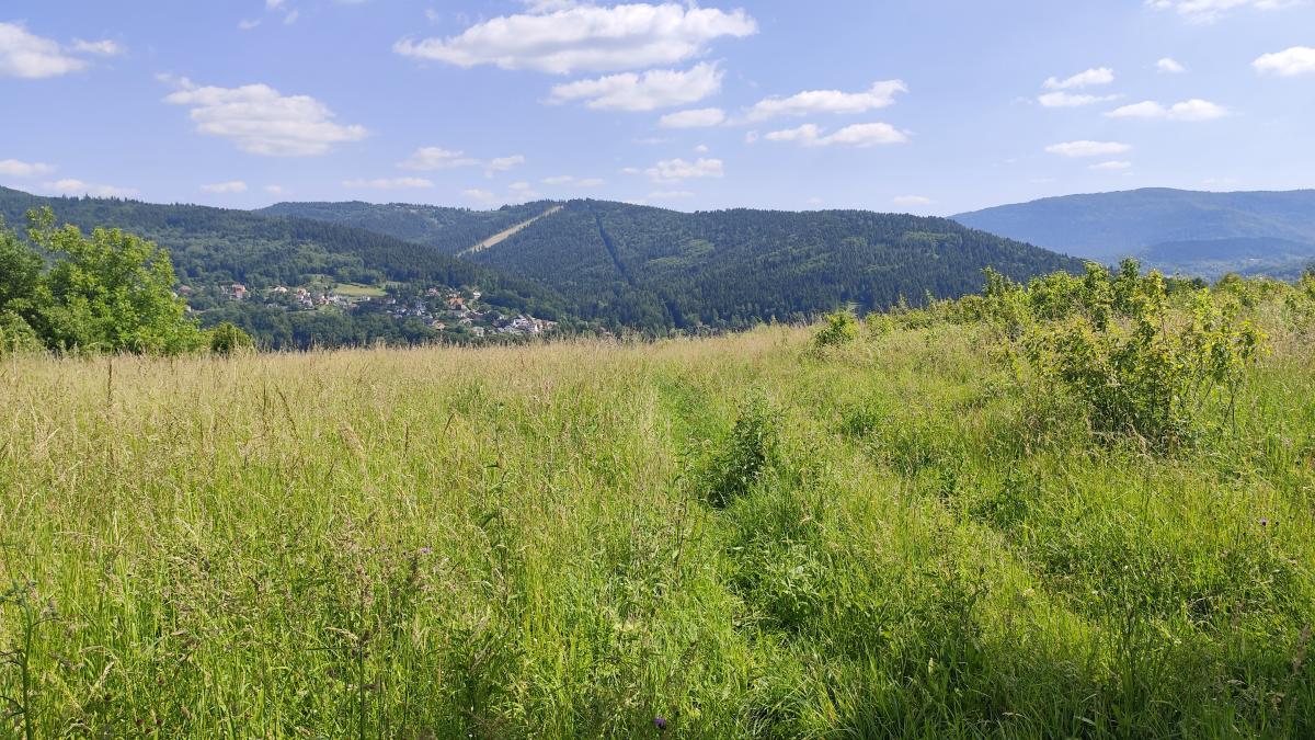 Przed nami wzniesienie Starowidz (534 m n.p.m.) i znowu zaczyna się asfalt. Na szczęście polana jest odsłonięta i raczy nas widokiem Pilska oraz Laskowca, w kierunku którego zmierzamy. Przed nami w dolinie Zembrzyce. Asfalt będzie nam towarzyszył już do samego końca dzisiejszego odcinka. On wygrał dziś bezdyskusyjnie. Drugi dzień kończymy w agroturystyce Gryglówka.