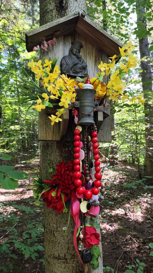 Osada Kramarki to kolejny punkt na naszej trasie. Znów asfalt, ale tym razem odsłania się ładny widok na Babią Górę oraz fragment Jeziora Mucharskiego, wokół okazałe dacze i oczywiście kapliczka, przy której odpoczywa pielgrzymka. Jest wielu pątników, samochody zabezpieczające i grill.
