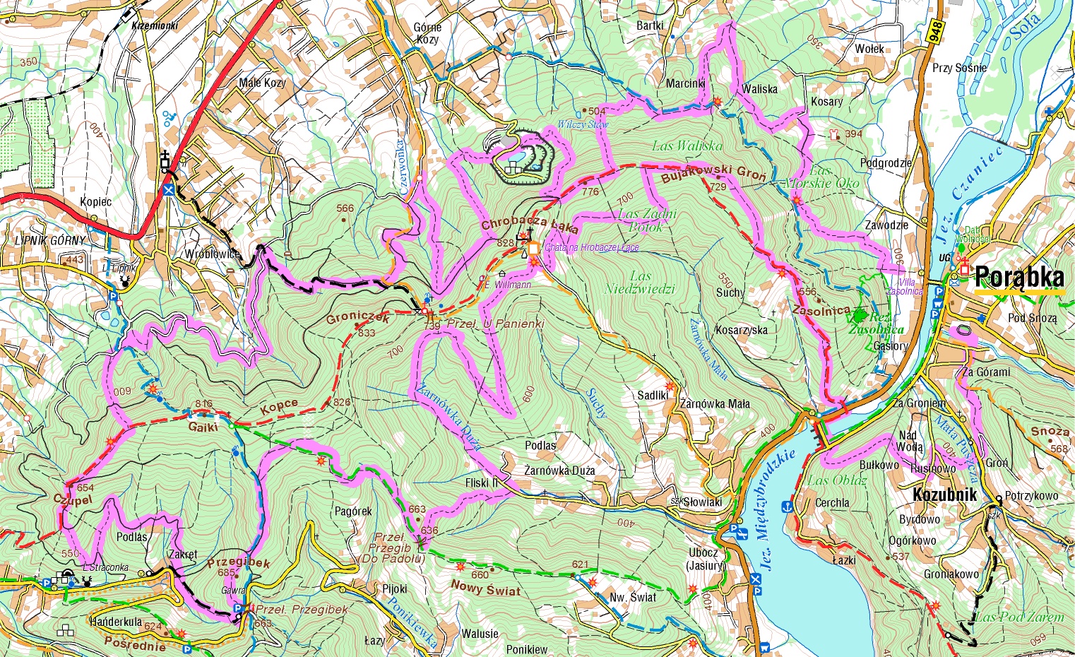 zielony, czerwony: Porąbka – Bujakowski Groń – Chrobacza Łąka – 3 h ↑ 2 h ↓