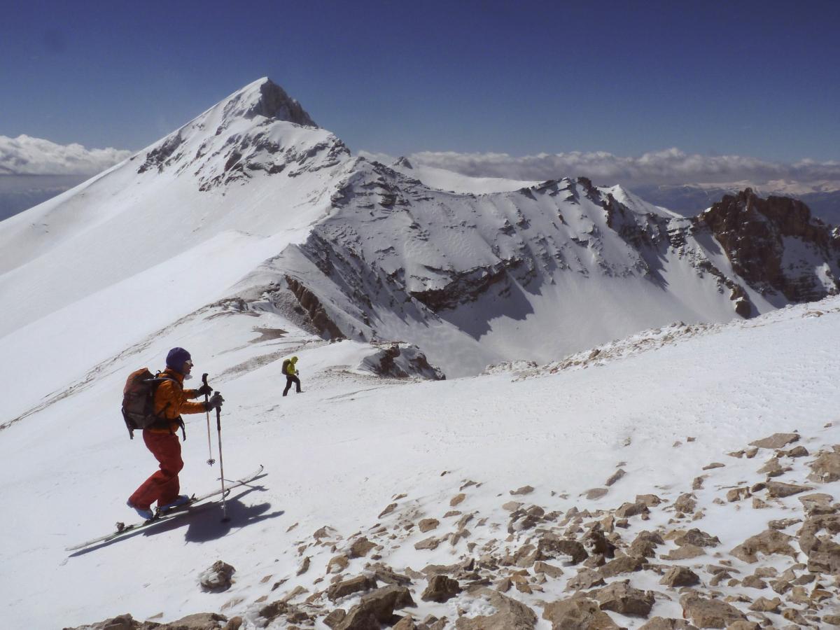 Po około trzech godzinach, na wysokości 2600 m n.p.m., teren stał się węższy i bardziej stromy, a ośnieżone zbocza przeszły w skaliste. W tym miejscu dolina skręca na wschód i wreszcie pojawia się widok na szczyt. Choć do wierzchołka pozostało tylko 600–700 m przewyższenia, zajęło nam to kolejne trzy godziny. Nic dziwnego, bo nasze tempo znacząco spadło. Mimo że znajomi przecierali ślad, ostatnie zygzaki były bardzo wymagające, a wysokość i przebyty dystans dawały się we znaki. Tylko widok wyłaniających się szczytów i perspektywa zjazdu po świeżym śniegu pchały nas dalej.