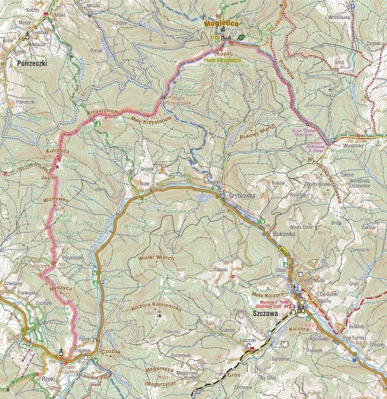 żółty: Mogielica – Jasień 1h 50 min ↓; 2h 20 min ↑