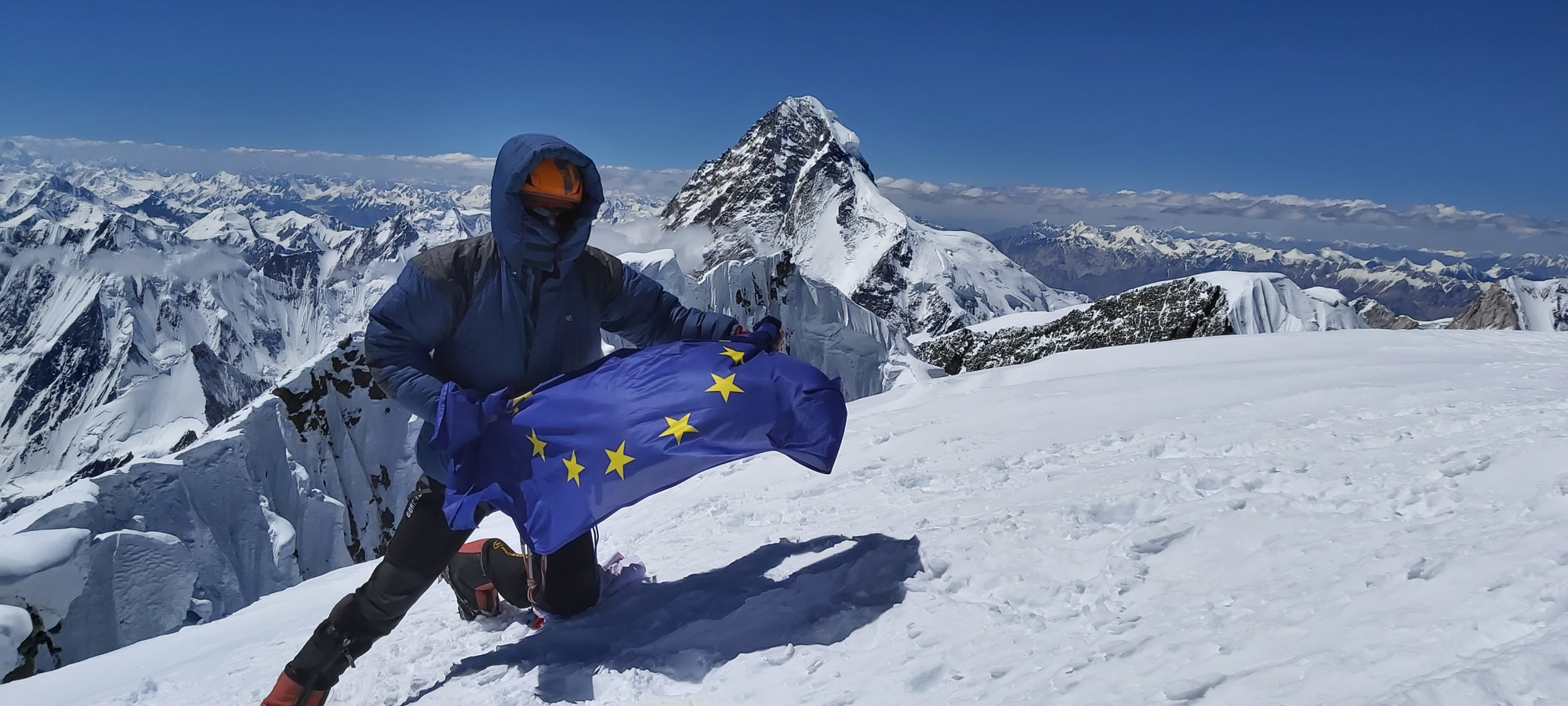 Nie tylko, bo najpierw polską, ale w świat poszło zdjęcie z flagą unijną. Ja zresztą na wszystkie wyprawy zabieram ze sobą te dwie flagi. Uważam, że są wyrazem mojej tożsamości - jestem Polakiem i Europejczykiem. Okazało się, że to było pierwsze wejście z flagą Unii Europejskiej na szczyt ośmiotysięczny, bez tlenu i bez tragarzy. Co ciekawe, dawniej, na historycznie pierwsze wejścia na ośmiotysięczniki, obok narodowej, zabierano też flagę ONZ. Tydzień po zejściu, w Skardu, gdzie po raz pierwszy miałem dostęp do internetu, opublikowałem w mediach społecznościowych to zdjęcie z flagą unijną, dołączając pozdrowienia dla pani Krystyny Pawłowicz.