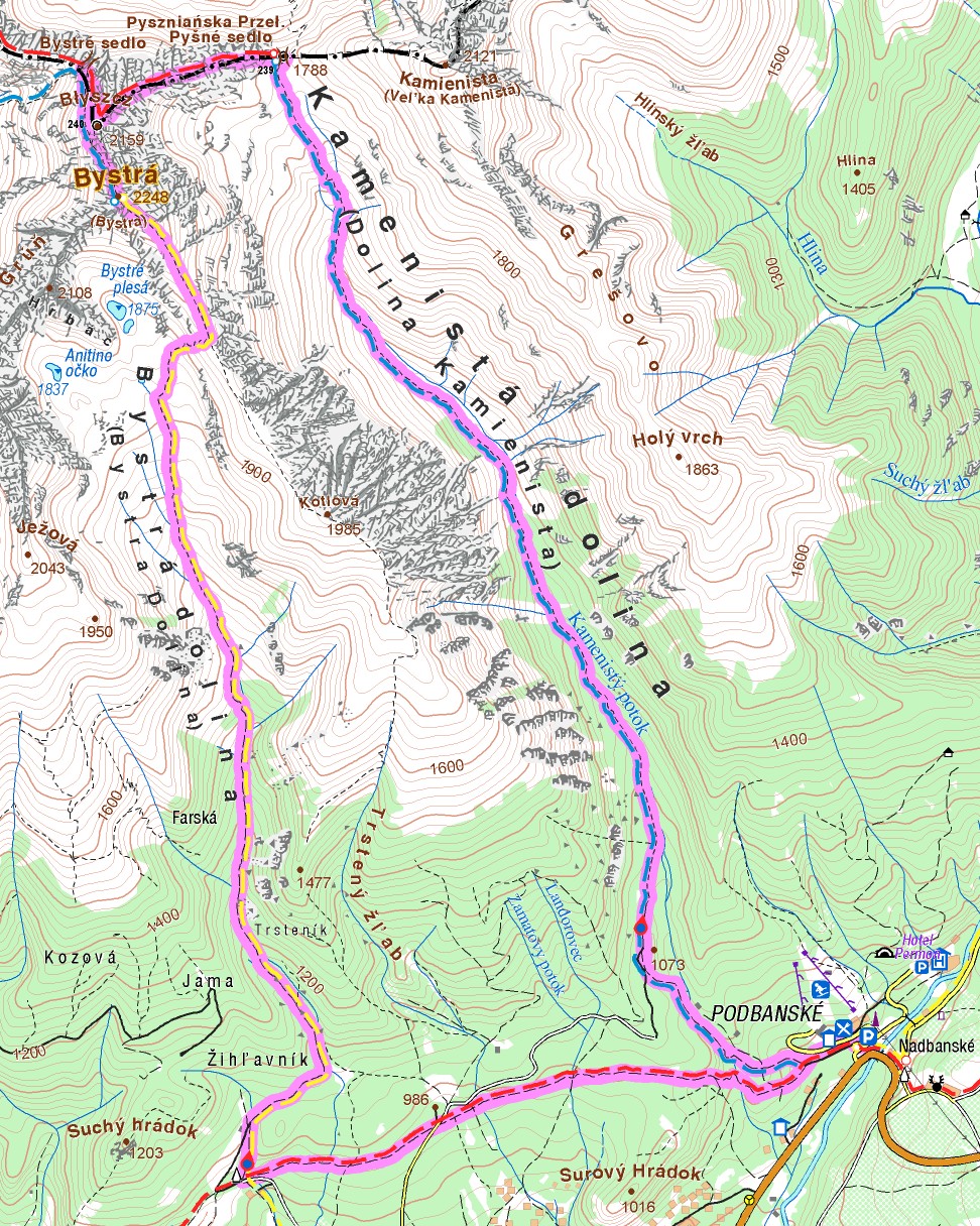 czerwony: rozejście szlaków pod Bystrą – Podbanské 1 h 15 min ↓↑