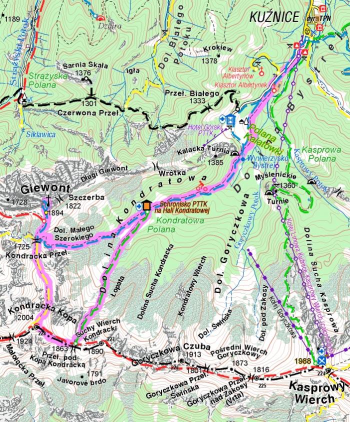 niebieski: Kuźnice – Polana Kalatówki – Hala Kondratowa – Przełęcz Kondracka – Giewont 3 h 30 min ↑ 2 h 40 min ↓