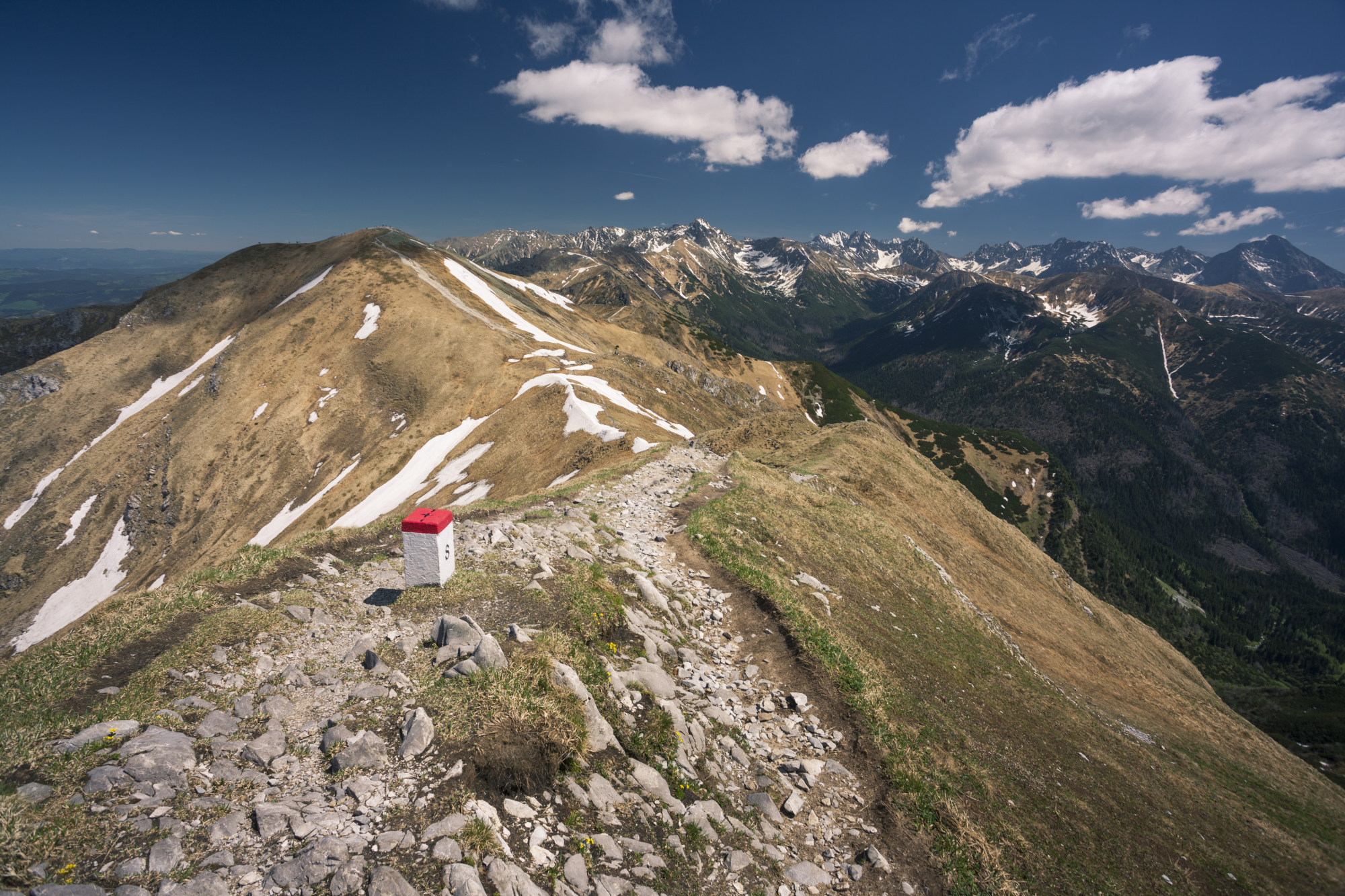 Pora była dosyć wczesna. Nie czuliśmy wielkiego zmęczenia, aura wciąż dopisywała, a przed nami rozpościerała się wspaniała panorama na główną grań Tatr Zachodnich z Czerwonymi Wierchami. To nas skusiło. Nie chcieliśmy też schodzić tą samą drogą, bo na Kondracką Przełęcz (1725 m n.p.m.), gdzie krzyżują się szlaki, docierało coraz więcej osób podążających w stronę Giewontu. Ruszyliśmy więc na Kopę Kondracką (2005 m n.p.m.), na którą prowadzi bardzo szeroka ścieżka.