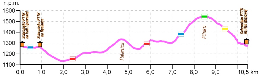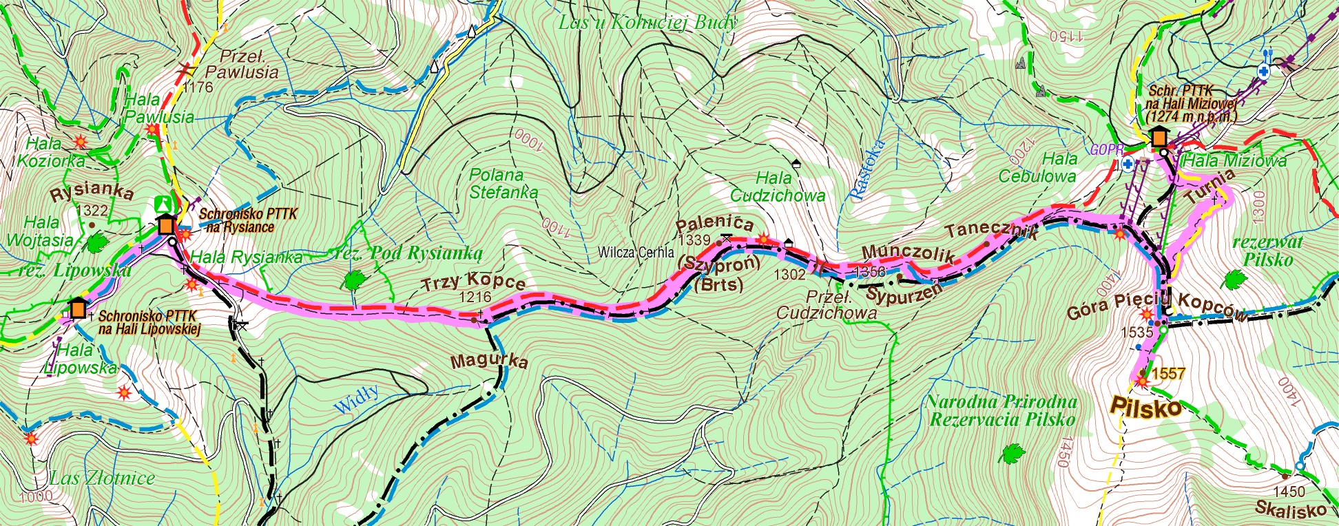 Początkowo idę trochę w dół, po czym szlak zaczyna piąć się w górę. Najpierw delikatnie do Trzech Kopców (1211 m n.p.m.), potem trochę mocniej aż do Palenicy (1338 m n.p.m.). Przystaję na chwilę, by złapać oddech, choć teraz czeka mnie znowu zejście. Dochodzę do Hali Cudzichowej. Wiosną znajdzie się tu coś dla fanów krokusów, a latem dla amatorów wiatingu. Na hali jest bowiem postawiony mały szałas. Słońce już świeci na dobre, a niebo maluje się pięknym błękitem. Tu w końcu mogę podziwiać panoramę. Rozległa polana otwiera widok na mój dzisiejszy cel – Pilsko (1557 m n.p.m.).