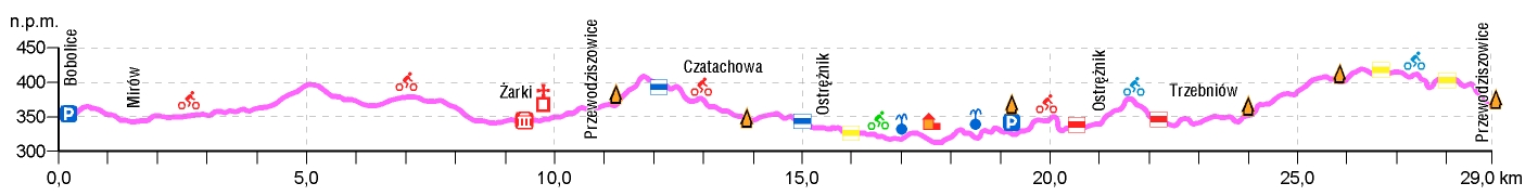 Pętlę rozpoczynamy w Przewodziszowicach za Żarkami. Przy drewnianej wiacie wypoczynkowej oraz placu zabaw znajduje się parking, gdzie możemy zaparkować auto. Ostrym asfaltowym podjazdem wśród pól szlak poprowadzi nas na północ w stronę Ostrężnika.