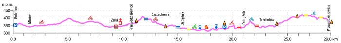 Na początku podjazd jest dość wymagający. Na takie odcinki przyda się więc wspomaganie. U naszych dzieci sprawdził się shotgun – „awaryjna” linka holownicza. Nie jest to jednak mordercze przewyższenie, w końcu jesteśmy na wyżynie, a nie w górach. Zresztą gdy mamy kłopot, to z roweru zawsze można zejść i chwilę go podprowadzić. I tak jedziemy, raz z górki, raz pod górkę. Minąwszy Czatachowę, zbliżamy się do ruin zamku z XIV wieku w Ostrężniku. Można zatrzymać się na zwiedzanie, jednak bardziej spektakularne są położone w okolicy charakterystyczne formy skalne.