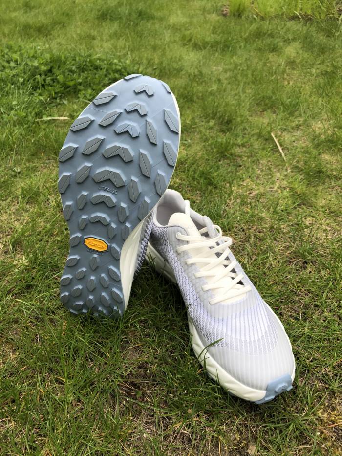Pierwsze zaskoczenie to brak wkładki. Dzięki temu oszczędzamy na wadze (205 g), ale też dostajemy dużo lepsze dopasowanie do stopy i „czucie” niemal każdej przeszkody na trasie. Już samo zmieszczenie się w ten model jest wyzwaniem dla osób z szeroką stopą (tak, to ja). Za każdym razem musiałem luzować sznurówki, aby przebrnąć przez opinający śródstopie pasek. Jednak szczerze powiem – warto się poświęcić. Po każdym założeniu miałem wrażenie, jakbym wyszedł od szewca z butem zrobionym na miarę. Jednak jeszcze bardziej ciekawiła mnie podeszwa wykonana z gumy Vibram Megagrip, bodaj najpopularniejszej mieszanki stosowanej w szeroko pojętych butach górskich.