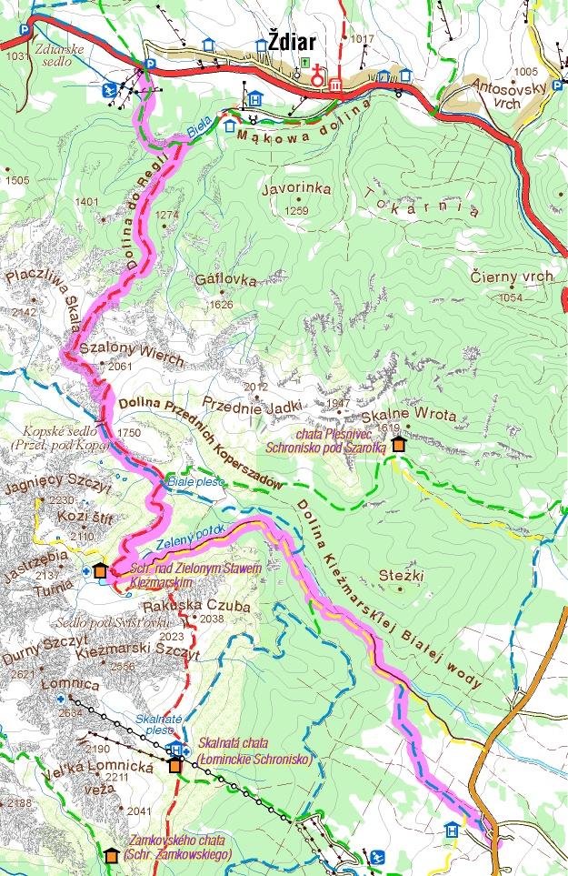 czerwony: Dolina Mąkowa – Szeroka Przełęcz – Przełęcz pod Kopą - Schronisko nad Zielonym Stawem Kieżmarskim 4 h 45 min ↑ 4 h 40 min ↓