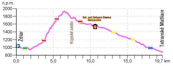 żółty: Schronisko nad Zielonym Stawem Kieżmarskim – rozejście szlaków nad Matlarami 2 h 5 min ↓ 2 h 30 min ↑