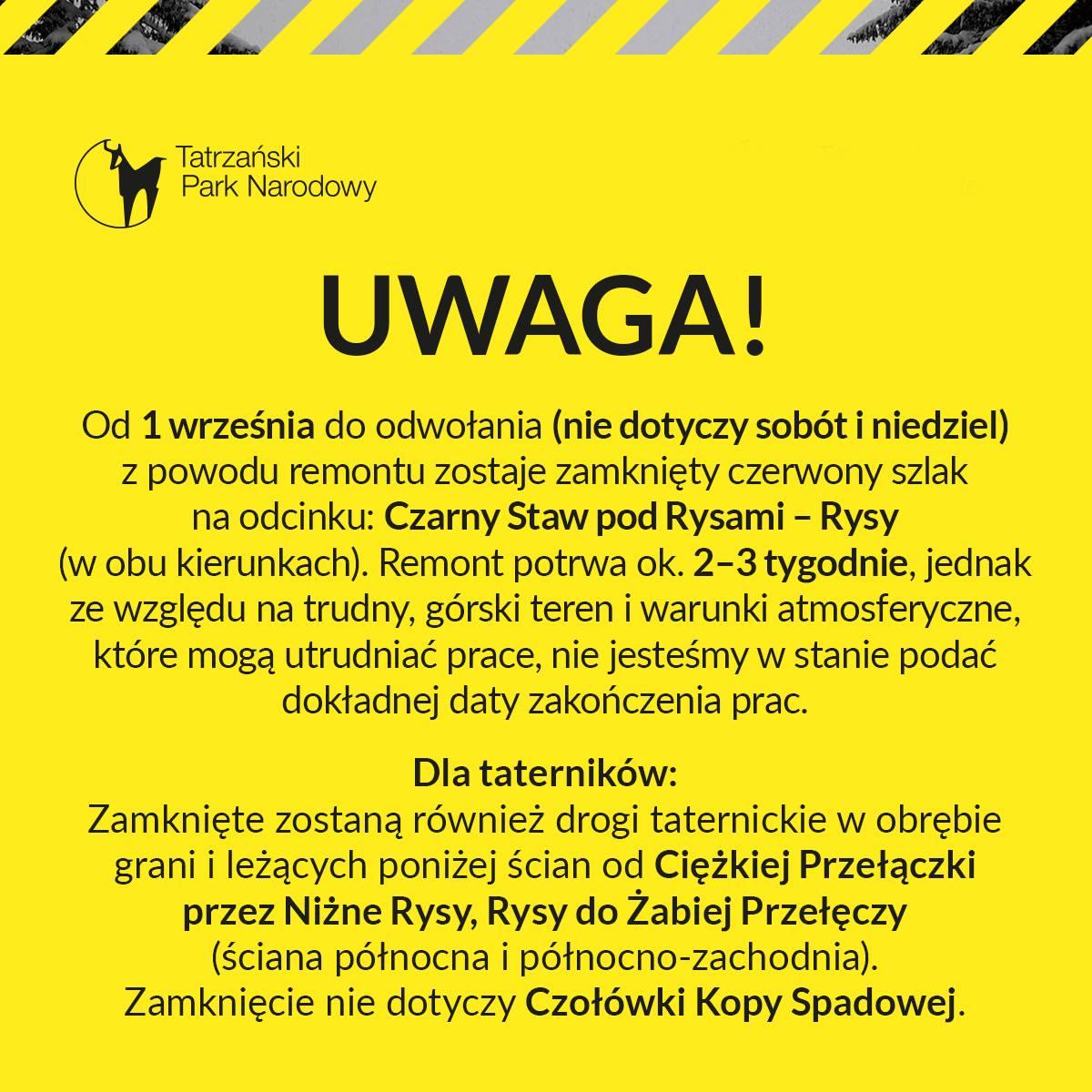 Od 1 września do odwołania zostaje zamknięty czerwono znakowany szlak na odcinku: Czarny Staw pod Rysami – Rysy (w obu kierunkach) z wyłączeniem sobót i niedziel.