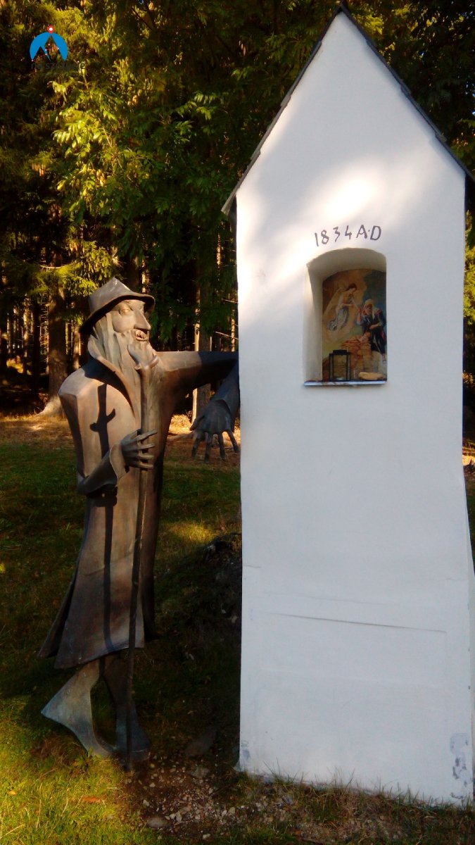 Asfalt szybko się kończy i wchodzimy na leśną zacienioną drogę. Po drodze mijamy kapliczkę z dosyć ciekawą rzeźbą. Jesteśmy zaintrygowani. Jak się okazuje, to Kapliczka Kolumnowa (Sloupová Kaplička). Została zbudowana przez miejscowych na trasie z Pecu pod Śnieżką do Zielonego Dołu (Zelený Důl) w 1834 roku. Z czasem zaniedbywana, ostatecznie została zniszczona. Na szczęście dzięki inicjatywie lokalnego kowala Libora Hurdy 17 lat temu została odrestaurowana, a obok niej stanął stalowy posąg pielgrzyma, przy którym wszyscy chętnie się teraz fotografują. Przyznam się, że każde z nas również ma zdjęcie z oryginalnym pielgrzymem.