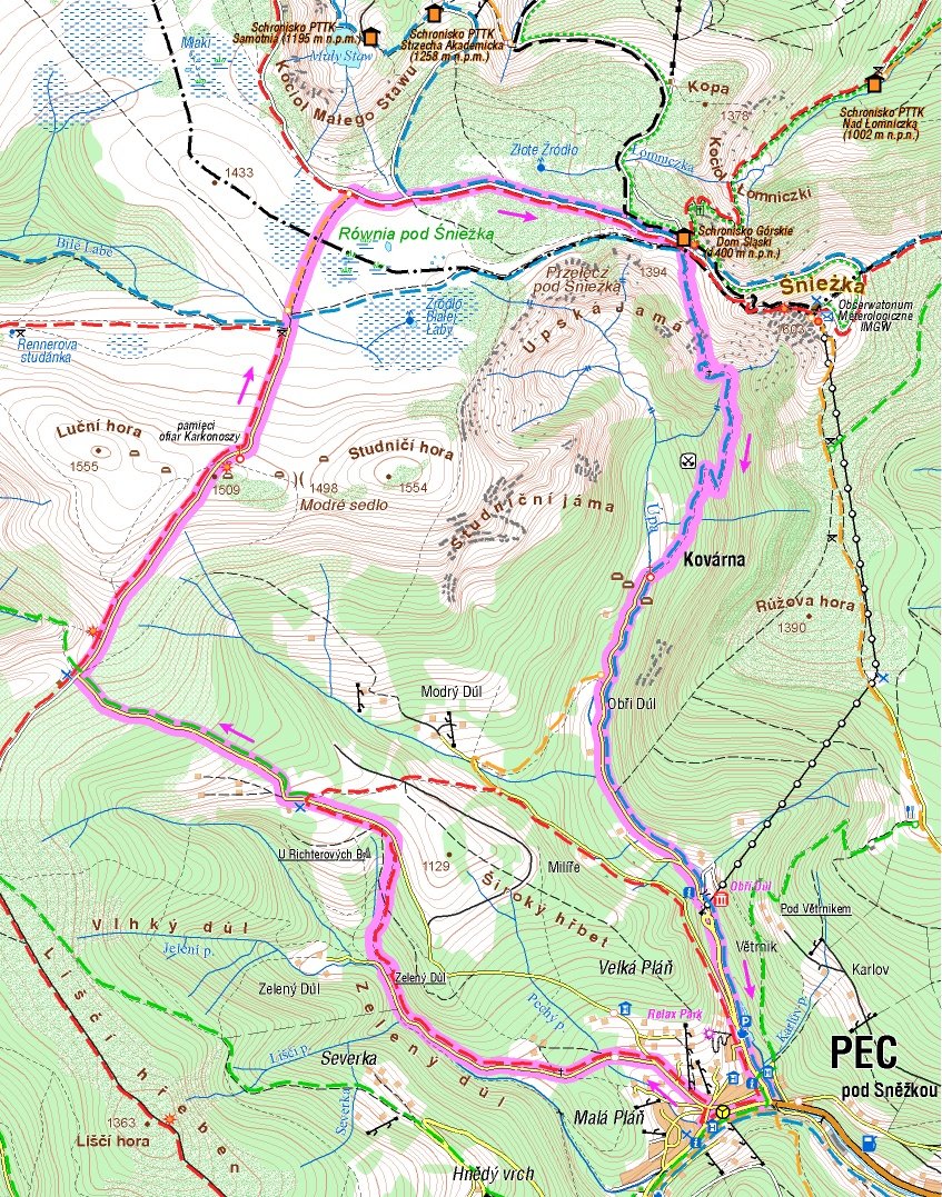czerwony: Pec pod Sněžkou - Richtrovy boudy 1 h 30 min. ↑ 1 h ↓