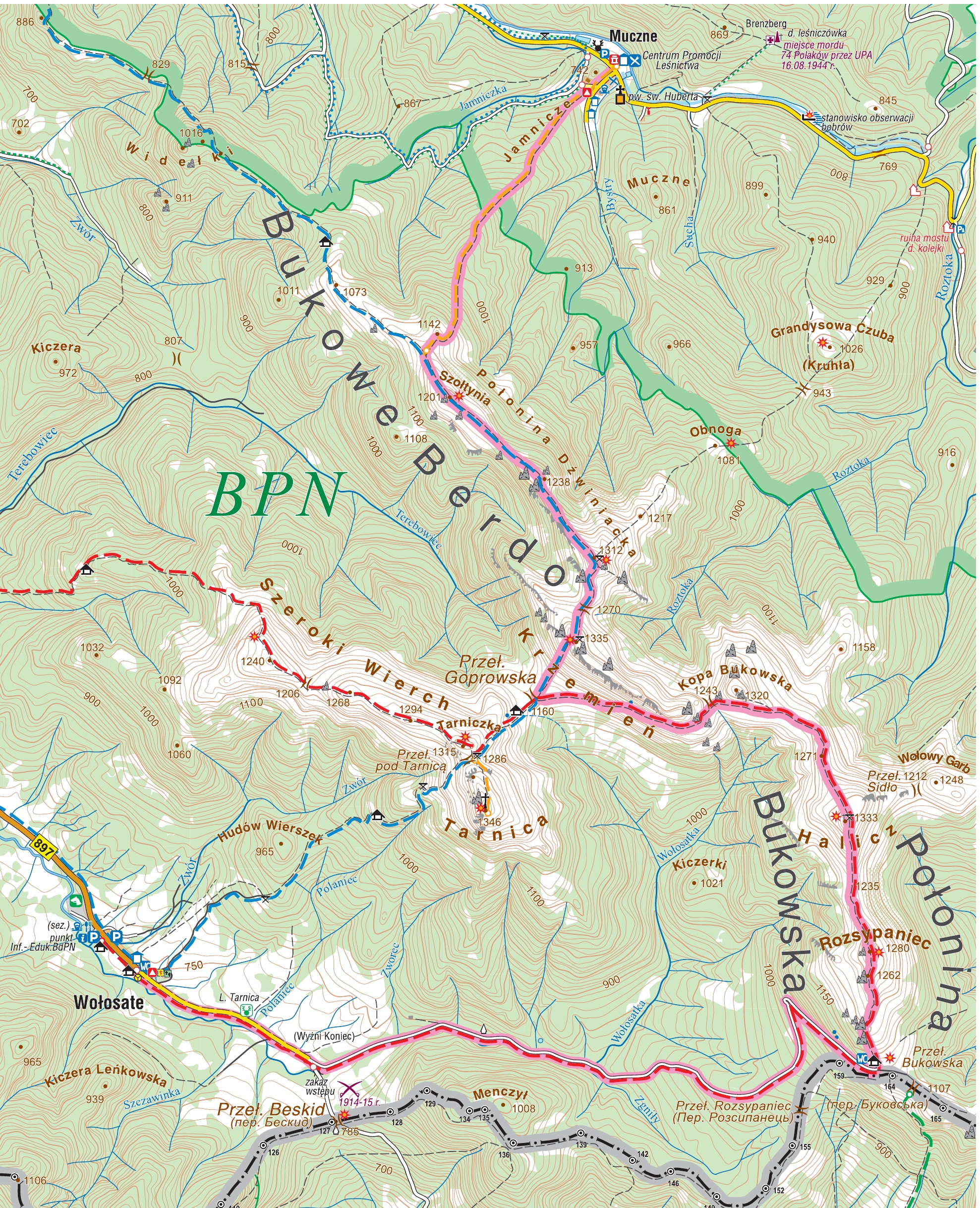 Takie legendy napędzają ruch turystyczny. Ale w Mucznem nie widać go tak bardzo, jak choćby w Ustrzykach Górnych po drugiej stronie gór. Tym chętnej wypatruję różnic wracając tu po kilku latach. Drogę nową jakby zrobili? Dziur chyba mniej? Ale to wciąż to samo urocze jedno skrzyżowanie, kilkanaście chałup i kawałek asfaltu. Niezmienne są też królowie puszczy w pokazowej zagrodzie żubrów i ścieżki dydaktyczne. W sam raz dla osób ceniących zwykłe spacery ponad górskie wyrypy. Za jedną z popularniejszych uchodzi Krutyjówka wijąca się przy meandrach potoku Muczny, między nadbrzeżną fauną i florą. Wraz z gratisową ciszą i spokojem. Nic dziwnego – żeby się tu dostać trzeba odbić w Stuposianach z Wielkiej Pętli Bieszczadzkiej przejeżdżając ponad 10 km.