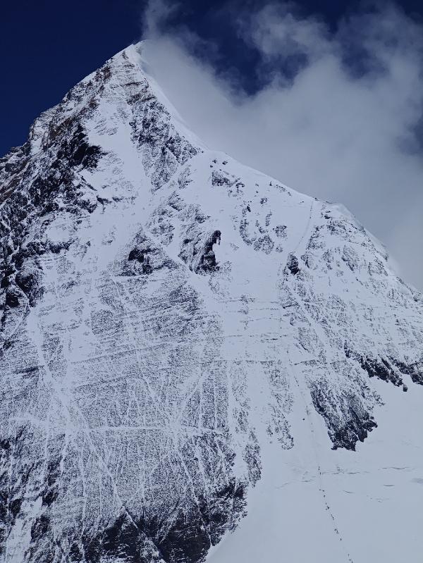 Lhotse mogę uznać za bardziej techniczne, wymagające wspinaczkowo, podczas gdy na Evereście trudnych odcinków w sumie nie było. Lhotse mnie też zmęczyło, bo ze względu na plan dotarcia wieczorem na Przełęcz Południową, wystartowałem na atak szczytowy dość późno, dopiero około 6 rano. Na dodatek, gdy wyszedłem, zobaczyłem trójkę wspinaczy, którzy jak założyłem, szli skrótem. Poszedłem więc za nimi. Po godzinie uznałem, że coś jest nie tak, bo zaczęły się strome trawersy. Później się okazało, że oni mieli zupełnie inny cel, bo zamierzali zeskoczyć z grani bocznej skokiem base jumping. Jak już wróciłem na właściwą drogę, to niby dobrze mi się szło, ale gdy słońce zaczęło na dobre operować, śnieg w kuluarze zrobił się nieprzyjemnie miękki, a na dodatek zaczęli schodzić ludzie, którzy niezamierzenie bombardowali mnie odłamkami lodu i kamieniami. Musiałem być bardzo czujny, aby uniknąć trafienia. Mentalnie nie pomagało mi też to, że nie wiedziałem, gdzie jest wierzchołek. Cały czas zakładałem, że już zaraz dotrę na wyczekiwany szczyt, ale niestety tak nie było.
