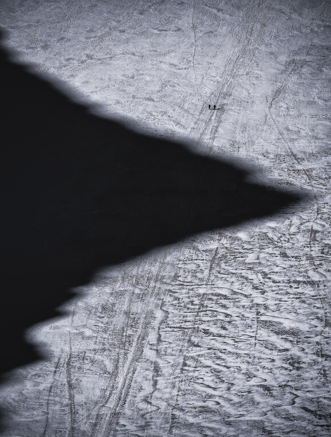 Odbicie Kościelca i dwoje ludzi podążających po zamarzniętym Czarnym Stawie Gąsienicowym. Zdjęcie Kuba Witos