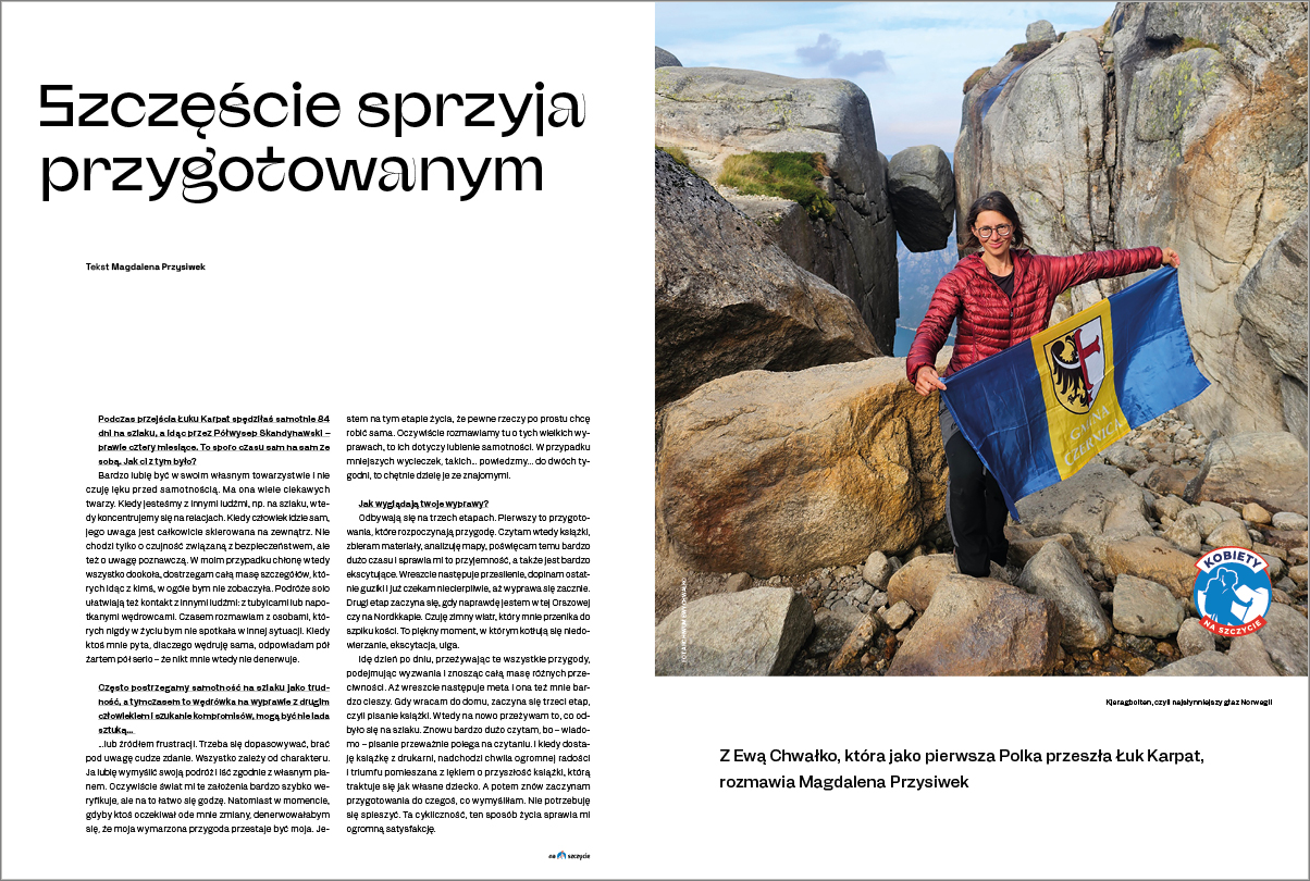 Zachęcamy też, by to właśnie latem zdobyć trzy najwyższe góry należące do Korony Gór Polski: Rysy (2499 m n.p.m.), Babią Górę (1725 m n.p.m.) i Śnieżkę (1603 m n.p.m.). A kto woli niższe góry, to polecamy m.in. Beskid Śląski z Baranią Górą, Wyspowy ze Śnieżnicą i Niski – w ramach kolejnego odcinka GSB. Mamy też nadzieję, że wszystkie dziewczyny zainspiruje Ewa Chwałko, pierwsza Polka i druga kobieta na świecie, która przeszła samotnie Łuk Karpat. Drogie Panie, gdy poznacie jej historię, nie będziecie już miały żadnych wymówek, podobnie zresztą, jak i Panowie.