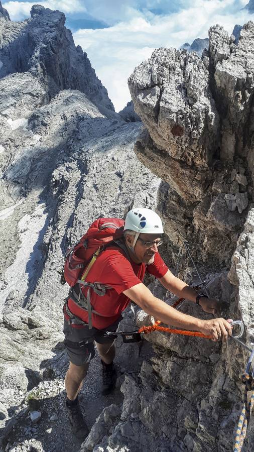 Żeby było jasne, to nie była trasa wiodąca przez lodowiec. Nie było tu spektakularnych trudności technicznych, ani siłowych fragmentów. Ale ekspozycja okazała się spora, drabinek i klamer nie brakowało. Przy zejściu po ośmiu godzinach wędrówki człowiek jest już wystarczająco zmęczony i wystarczy zachwianie równowagi czy zwykły zawrót głowy i bez wpięcia do stalowej liny, od razu można odpaść od ściany. Z pokorą przyznaję, że takie wejście nie powinno się wydarzyć, ale byliśmy „młodzi i głupi”.