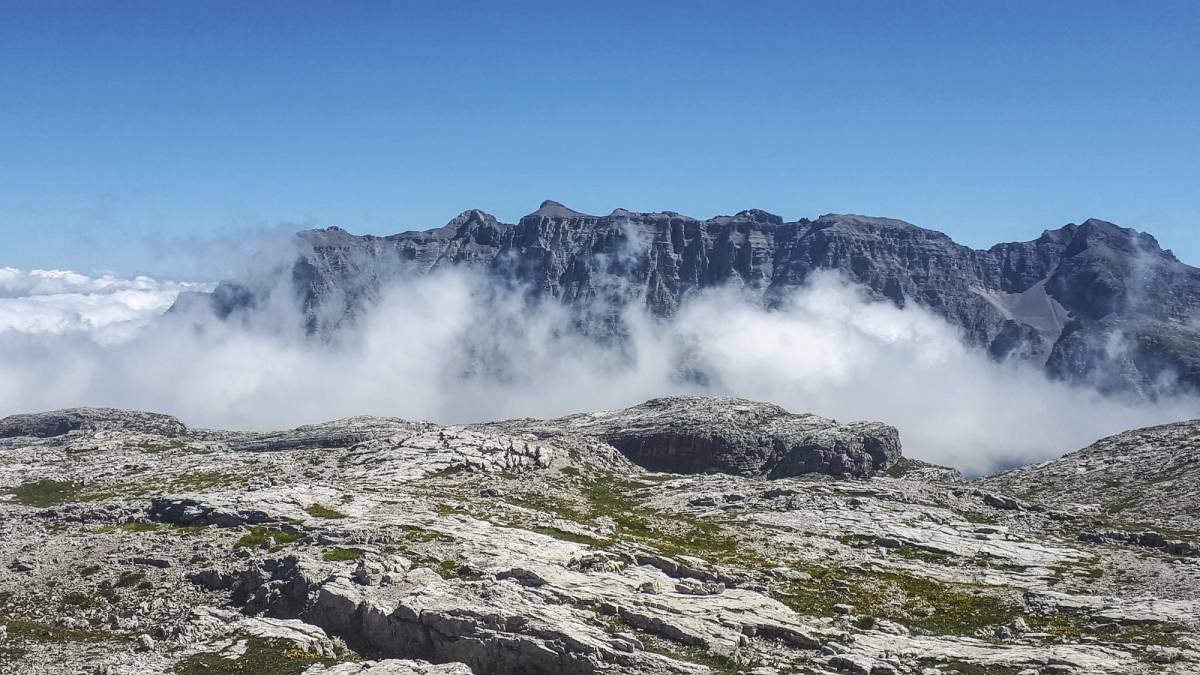 Ścieżka wiedzie najpierw szerszym piargiem, a potem wąskim rantem niemal przez środek ściany. Jak człowiek patrzy na to z dołu, to jest niemal pewien, że nie ma żadnej opcji, by tędy poprowadzić szlak, a jednak… Chmury odsłaniają nam kolejne szczyty na wyciągnięcie ręki – to między innymi Cima Roma (2837 m n.p.m.) i Cima Valazza (2803 m n.p.m.). Tkaczyk pisze, że widoki są tu nieco surrealistyczne. Ja tego nie dostrzegam, bo to trochę tak, jakby powiedzieć, że Kazalnica ze szlaku na przełęcz pod Chłopkiem, też wygląda surrealistycznie. A jej potęga sprawia, że człowiek czuje się wobec natury taki mały. I podobnie jest na tym szlaku.