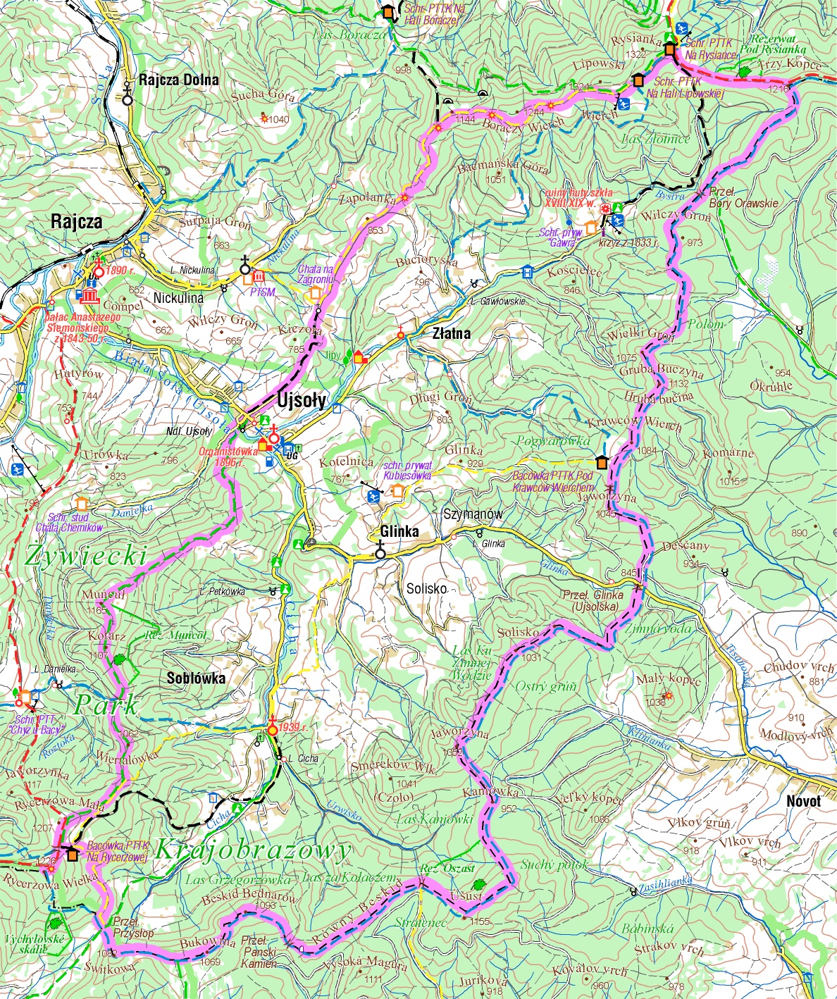żółty, czarny (10 km): Schronisko PTTK na Hali Lipowskiej - Haka Redykalna – Zapolanka – Kręcichłosty – Ujsoły 2 h 45 min ↓ 4 h ↑