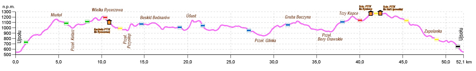 żółty, niebieski, czerwony (31,5 km): Bacówka PTTK na Rycerzowej – Przełęcz Przysłop – Pański Kamień – Oszust – Solisko – Przełęcz Glinka – Krawców Wierch – Trzy Kopce – Hala Rysianka – Schronisko PTTK na Hali Lipowskiej 10 h 15 min ↑↓