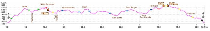 Łącznie ok. 52,5 km. Suma podejść i zejść wynosi 2574 m n.p.m., więcej wyżej niż Rysy z poziomu morza.