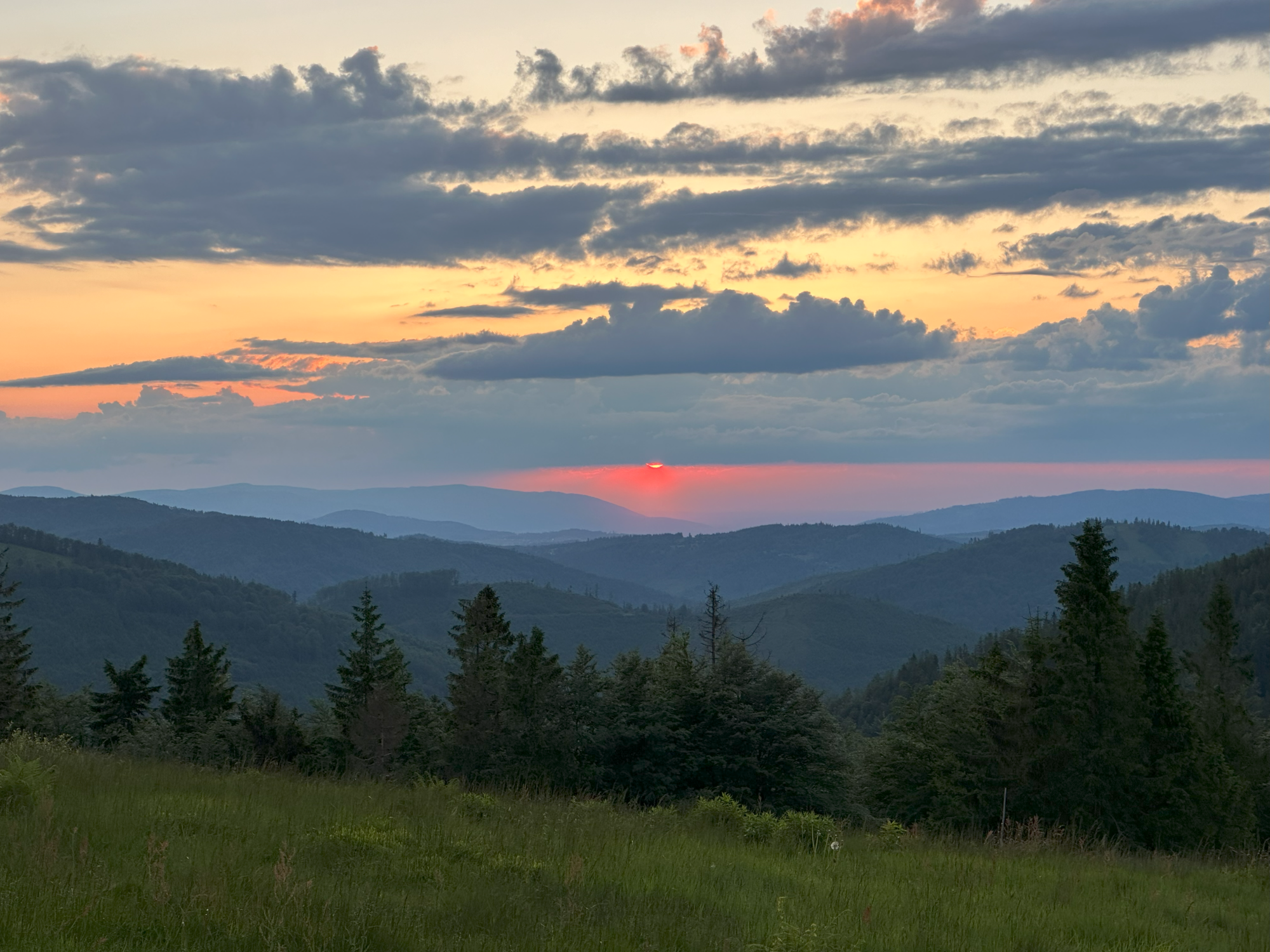 Od prawie 30 lat gospodarzem jest tu Darek Cegłowski, z którym nie mamy jednak okazji porozmawiać, bo akurat pojechał na koncert Stinga. My tymczasem po krótkim odpoczynku i posiłku podchodzimy wieczorem ponownie na Przełęcz Halną, by podziwiać zachód słońca. Towarzyszą nam w tych okolicznościach przyrody puszczane z telefonu piosenki nurtu „gitarą i piórem”. Wracają wspomnienia studenckich czasów.