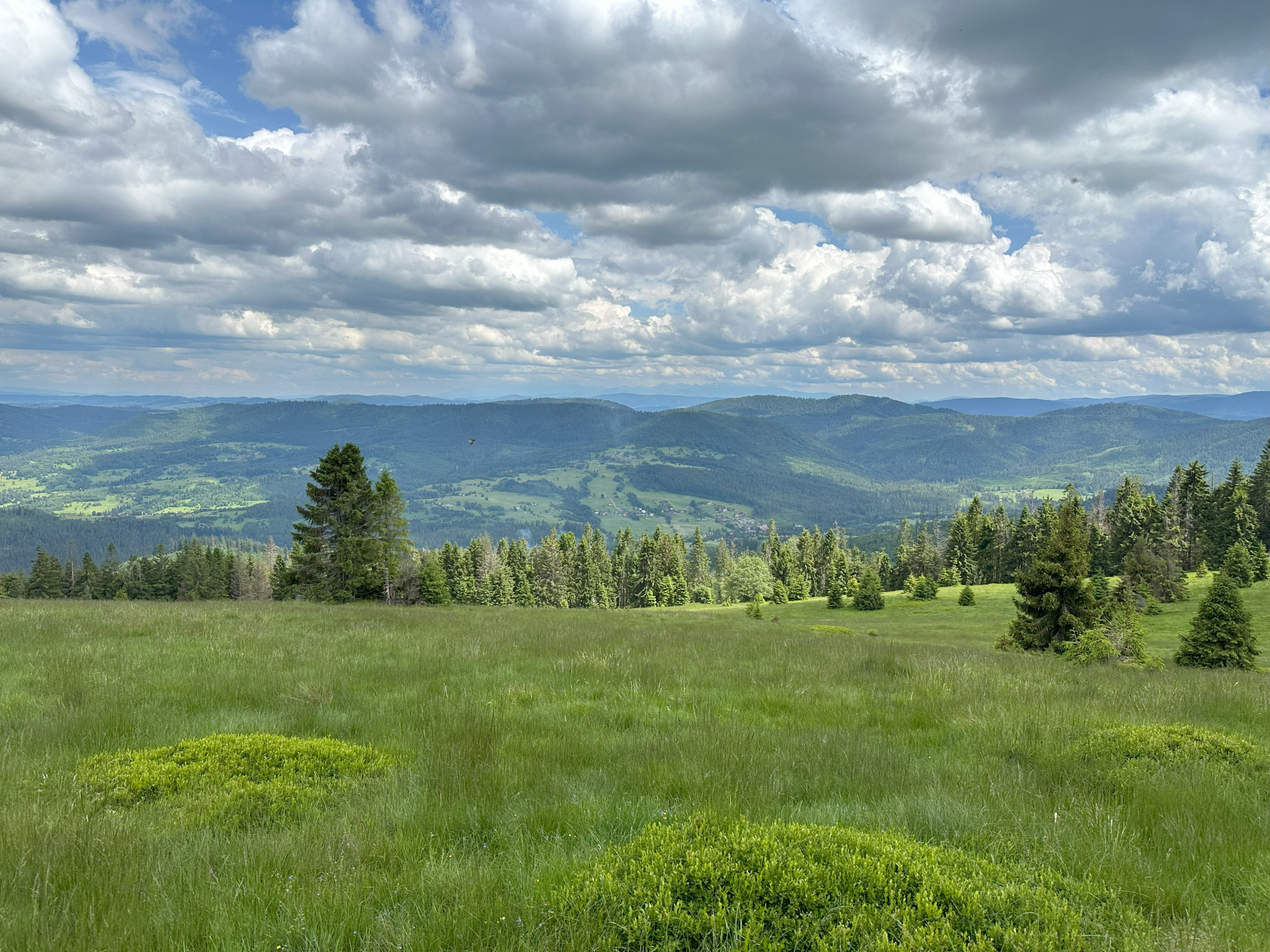 Niedaleko szczytu znajduje się wychodnia skalna, ale odpuściliśmy jej poszukiwania. Za to na południowym skraju zaczyna się leśny rezerwat przyrody Muńcoł, który ciągnie się dalej w stronę Kotarza (1107 m n.p.m.), drugiego tysięcznika na naszej trasie. Teraz otwierają się widoki na Małą Rycerzową z rozległą halą po prawej stronie.