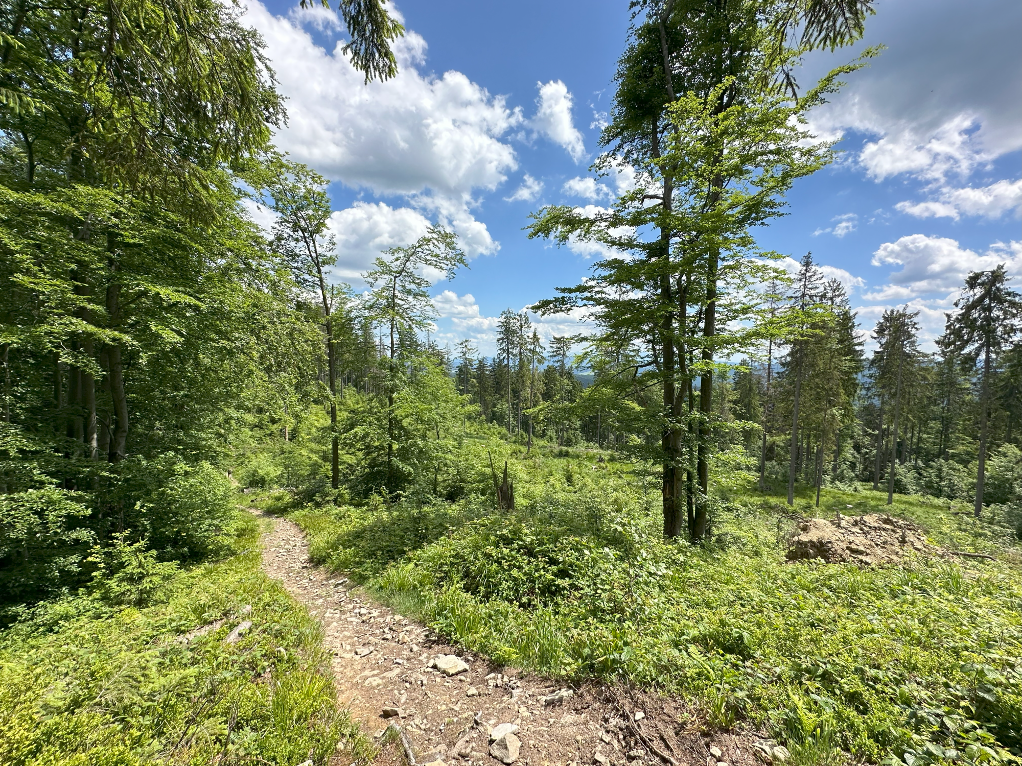 Wąska ścieżka zamienia się w szerszą drogę leśną, która schodzi w stronę przełęczy (975 m n.p.m.). Tu zaczyna się podejście na Wiertalówkę (1071 m n.p.m.).