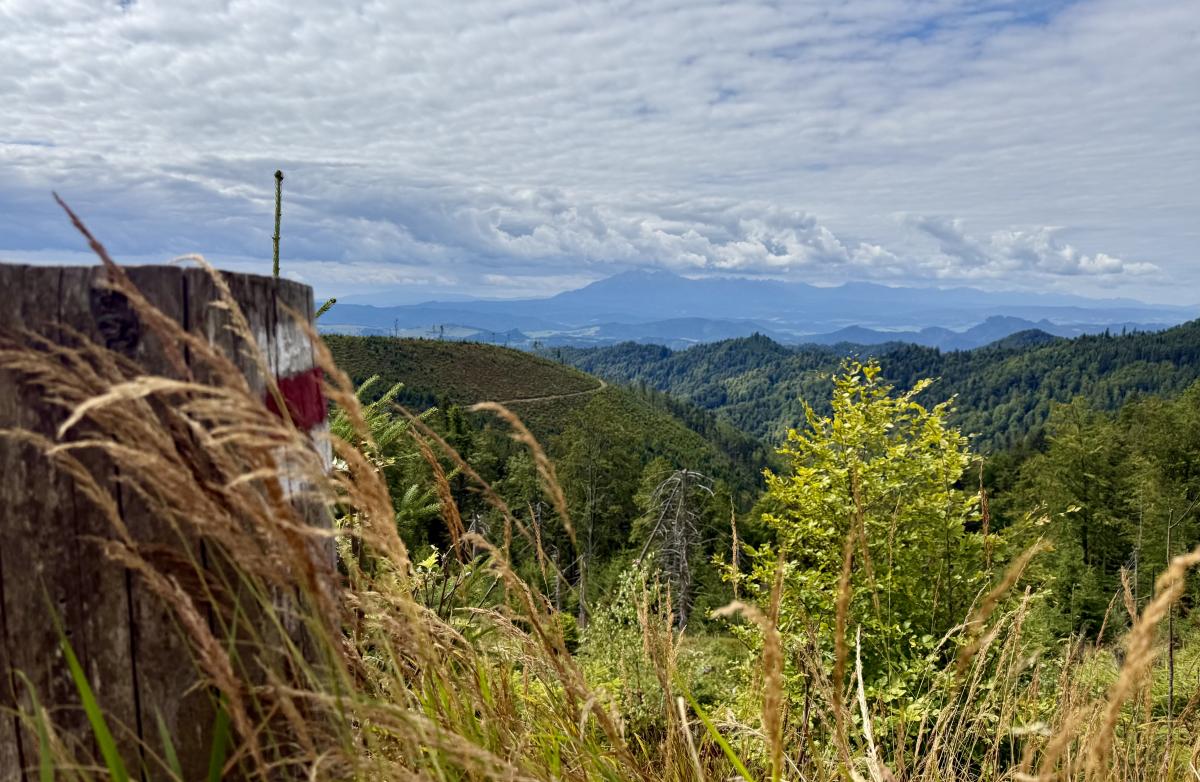 Znaczki są mniej lub lepiej widoczne, ale jednoosobowa ścieżka cały czas prowadzi nas w górę. Gdy wąski szlak dotrze do szerokiej i wygodnej trasy to znak, że jesteśmy już blisko. Ważne, by w tym miejscu znowu skręcić w lewo. Mijamy szlaban, wychodzimy na polanę i kilkadziesiąt metrów przed nami jest czerwony szlak, którym wędrowaliśmy rano w kierunku Wielkiego Rogacza i Radziejowej.
