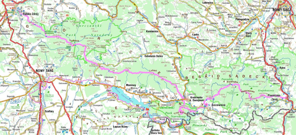 Jeśli chcemy przejść tę kilkudniową trasę, to odpada własne auta. Z Krakowa do Rabki-Zdroju dojedziemy pociągiem (bezpośrednie połączenie o godz. 7.16) albo busem (www.mda.malopolska.pl). W drogę powrotną wyruszymy z Piwnicznej-Zdroju pociągiem do Krakowa (bezpośrednie połączenia po południu w niedzielę o godz. 16.21, 18.44 i 20.22).