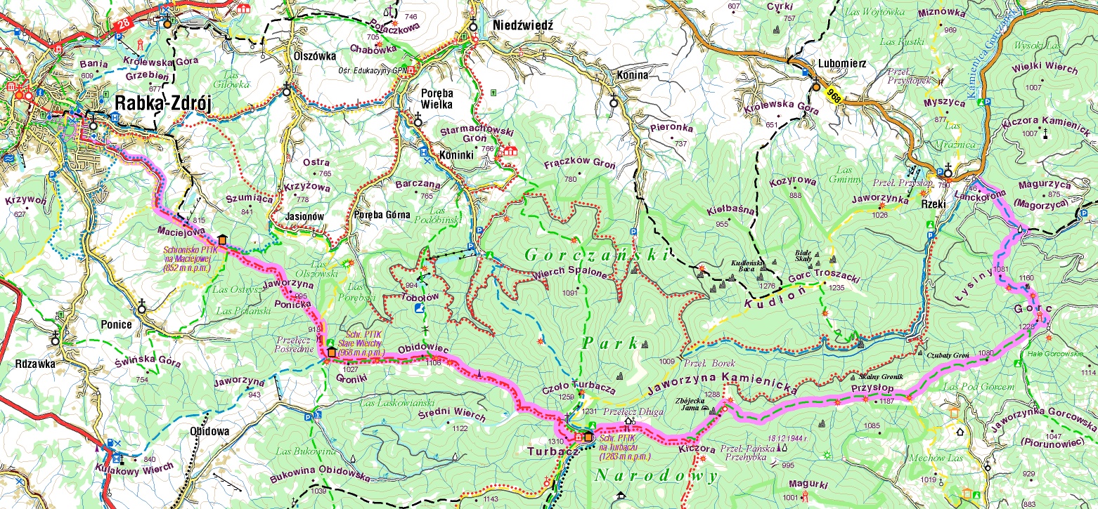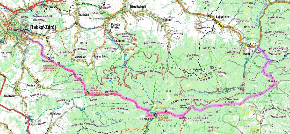 czerwony: Rabka-Zdrój – Maciejowa – Stare Wierchy – Turbacz 5h 45 min ↑ 4h 30 min ↓