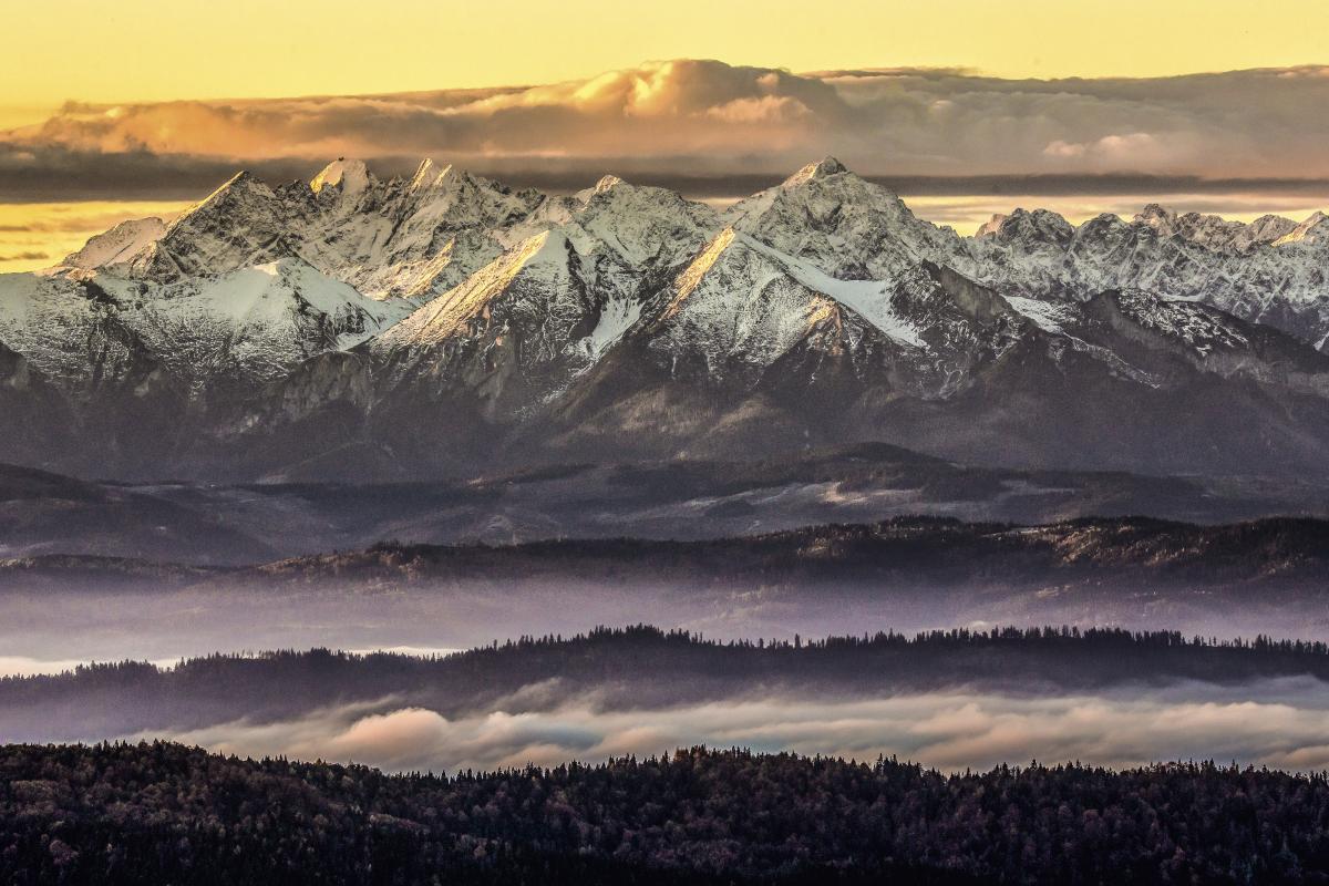 Dopiero przy śniadaniu widzimy dokładnie, że jadalnia ma kapitalny widok na Tatry, nad którymi zasklepił się dziś stalowy sufit. Planujemy wedrzeć się w głąb Parku i nie schodzić poniżej 1000 m n.p.m.