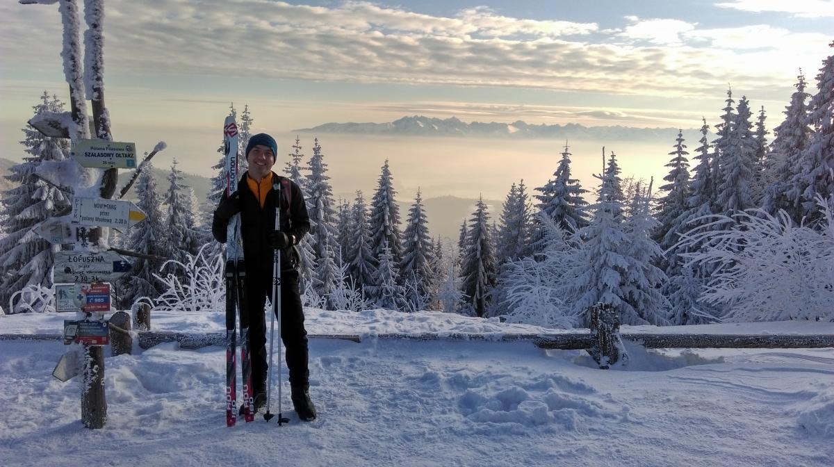 Mrużę oczy nawet w okularach przeciwsłonecznych, podziwiając biel śniegu i lukrowane kontury drzew. Na horyzoncie piętrzą się charakterystyczne grzbiety Beskidu Wyspowego, a pośród nich charakterystyczny grzbiet Mogielicy.
