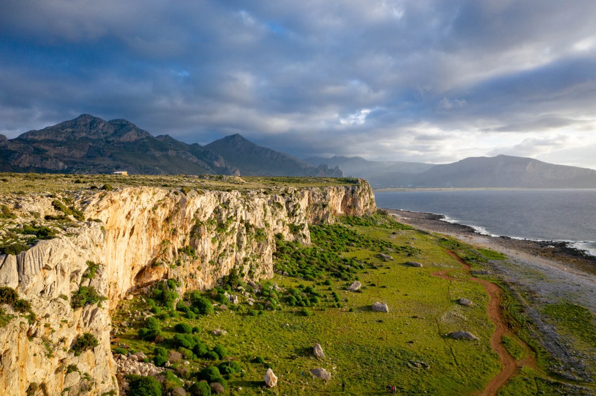 Nadmorskie drogi wciąż są błotniste, jeszcze wczoraj padało. Auto przebija się przez jeszcze jedną kałużę i parkujemy między dwoma kamperami. Przez przednią szybę widzimy morskie fale, po prawej mamy samotną białą wieżę latarni morskiej w San Vito lo Capo. W lewo ciągną się kamieniste plaże, zielone łąki i przede wszystkim wapienne klify, którym poświęcimy następne dwa tygodnie.