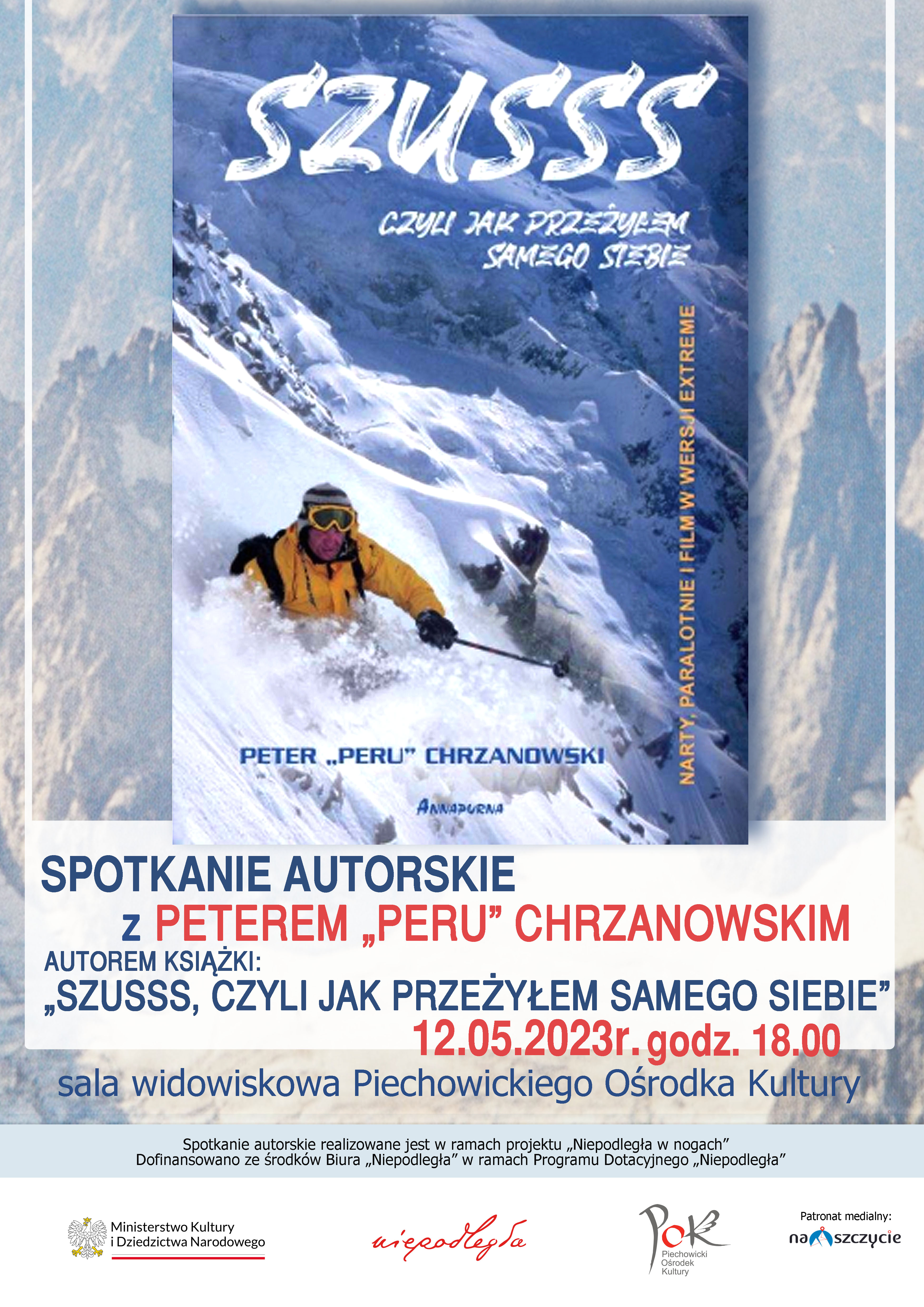 Już 12 maja 2023, o godz. 18.00 zapraszamy do sali widowiskowej Piechowickiego Ośrodka Kultury na nietuzinkowe spotkanie z autorem książki "Szusss" Peterem "Peru" Chrzanowskim! Kanadyjskim narciarzem ekstremalnym polskiego pochodzenia, paralotniarzem, podróżnikiem i filmowcem - nie można tego przegapić !