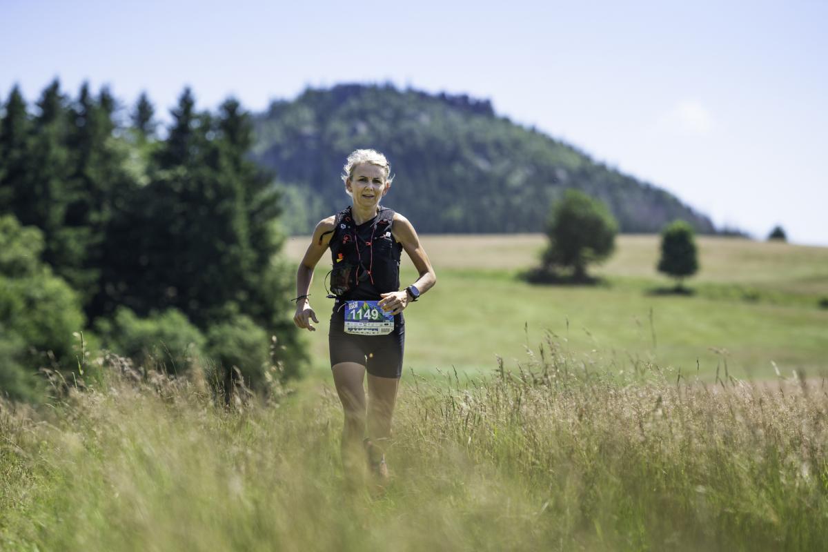 I gdy tylko kończy się odliczanie, biegowa masa wciska nas pędem na wąski mostek. Pierwsze kilometry to istna zabawa na łące. Rozległa Sawanna Pasterska (ok. 750 m n.p.m.) upstrzona skałkami i bajeczne kadry na Szczeliniec Wielki (919 m n.p.m.) sprzyjają dużym prędkościom. Czołówka już zdążyła odczepić się od peletonu, a starzy wyjadacze ze środka stawki wciąż jadą na hamulcu. Wiedzą, że na górskim ultra nie można zacząć za szybko, bo w tej zabawie kryzys i próg bólu na pstrym koniu jeżdżą. Ja również trzymam tętno na wodzy, mimo że ścieżka pod Schronisko PTTK Pasterka jest praktycznie płaska.