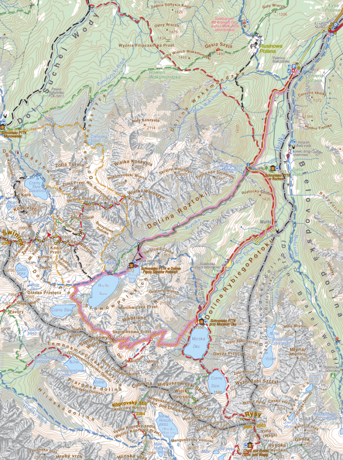 żółty: Morskie Oko – Szpiglasowa Przełęcz 2h 30 min ↑ 1h 50 min ↓