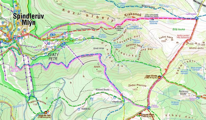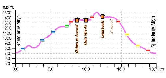 Z Chalupy Na Rozcesti idziemy do schroniska Luční bouda (1413 m n.p.m.), a potem wracamy do Szpindlerowego Młyna, żeby zrobić pętlę. Po drodze możemy zahaczyć o punkt widokowy Karkonosz (Krakonoš, 1422 m n.p.m.).