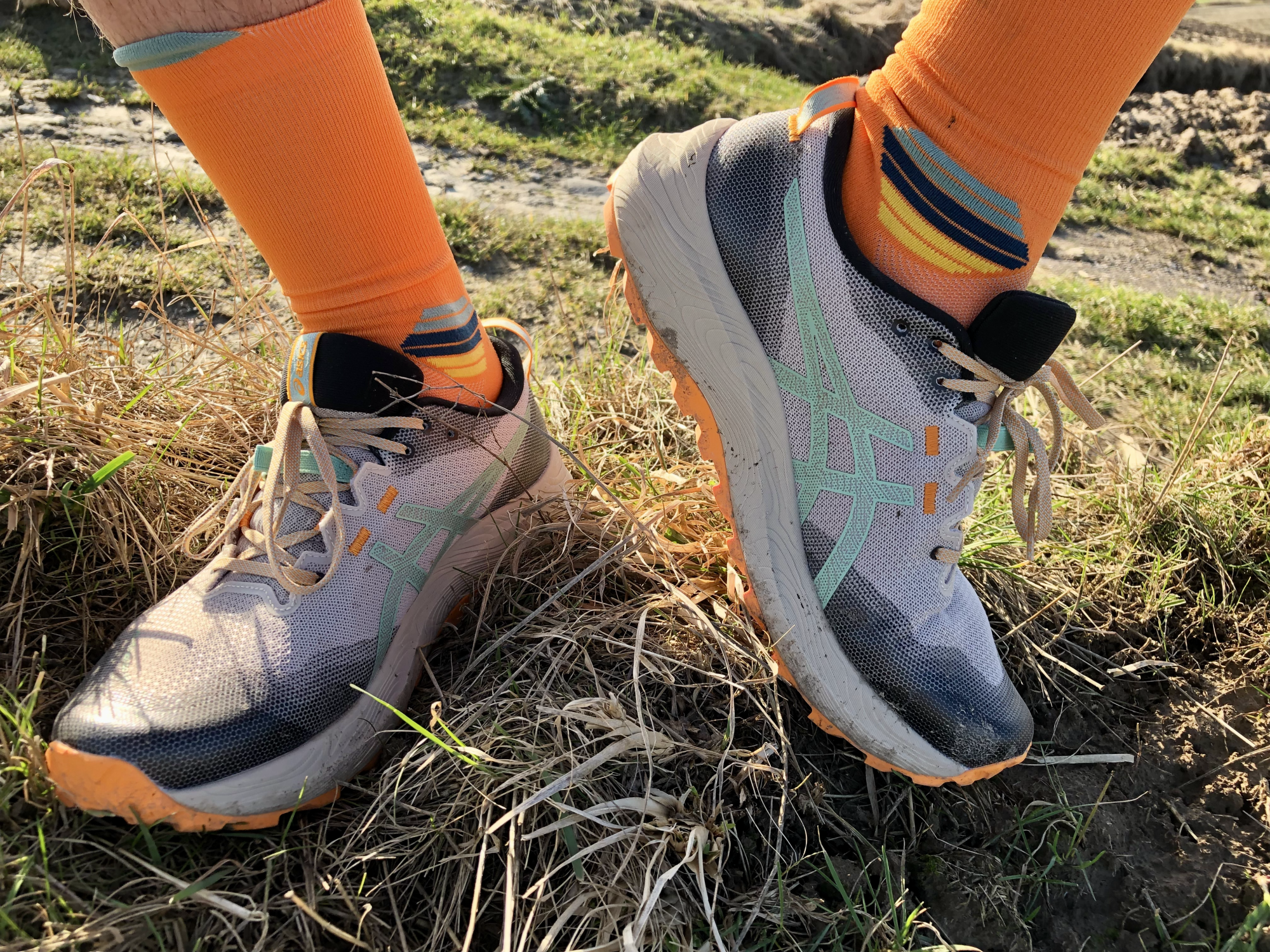 Z niecierpliwością czekałem też na deszcz. Na mokrej nawierzchni ASICS GEL-TRABUCO 12 nie straciły niczego ze swojej stabilności i przyczepności. Wręcz zyskały i to ze względu na cholewkę z siateczki technicznej. Co do zasady w ciepłe dni ma ona poprawić przewiewność, aby utrzymać stopy w chłodzie. A przy ulewie nie absorbować wody, podobnie zresztą jak wkładki. Dzięki temu przez cały czas wnętrze buta pozostało relatywnie suche, bez dodatkowych gramów wody.