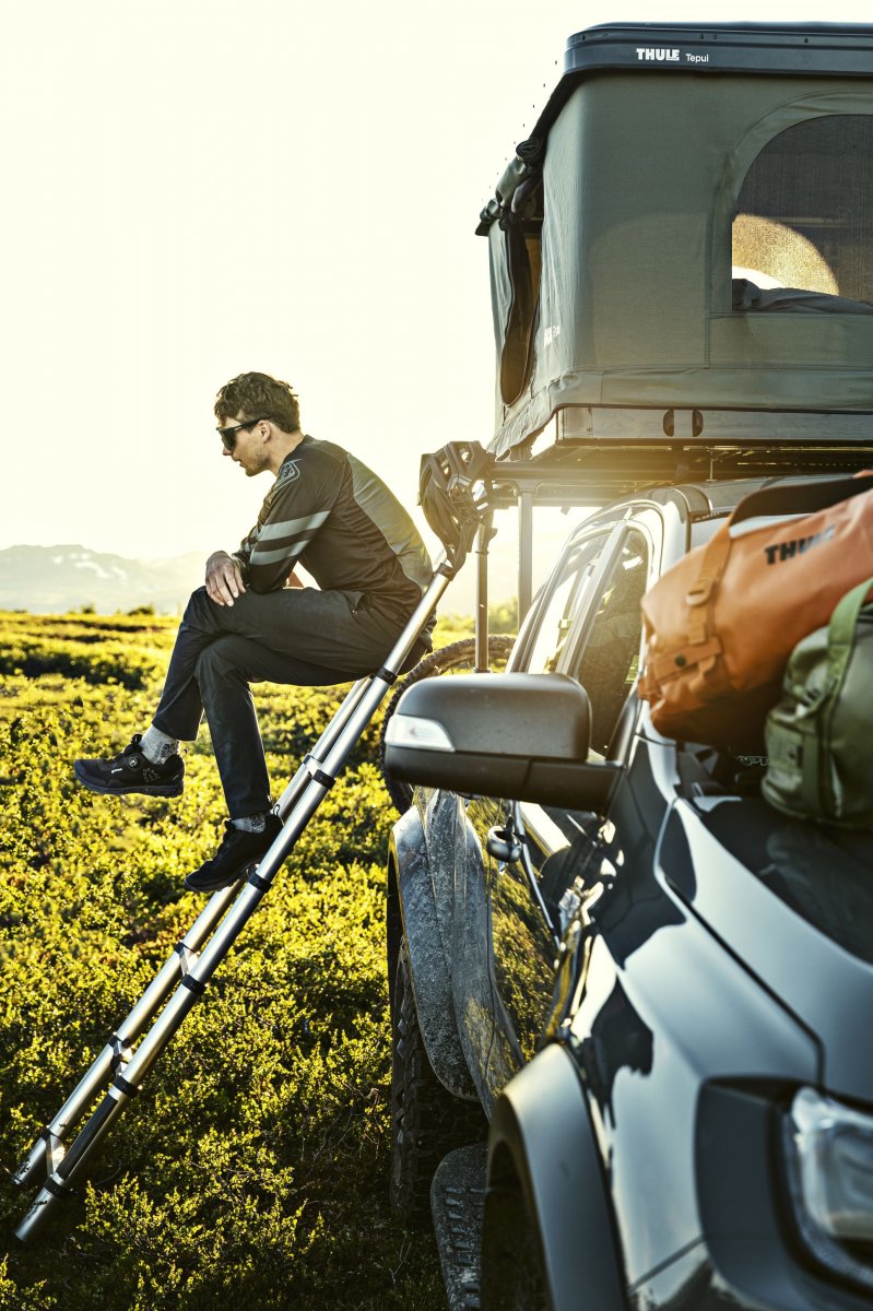 Za ów komfort odpowiada, również izolowany termicznie, sztywny dach oraz duże okna, które można otworzyć w celu uzyskania przewiewu, a także zabezpieczyć siatką przed owadami. Co istotne, rozłożony namiot nie wystaje poza obrys auta, minimalnie przekracza go jedynie dołączona teleskopowa drabina. To z kolei oznacza, że Thule Basin rozłożymy również w miejscach, gdzie na tradycyjny namiot dachowy mogłoby nie być miejsca.