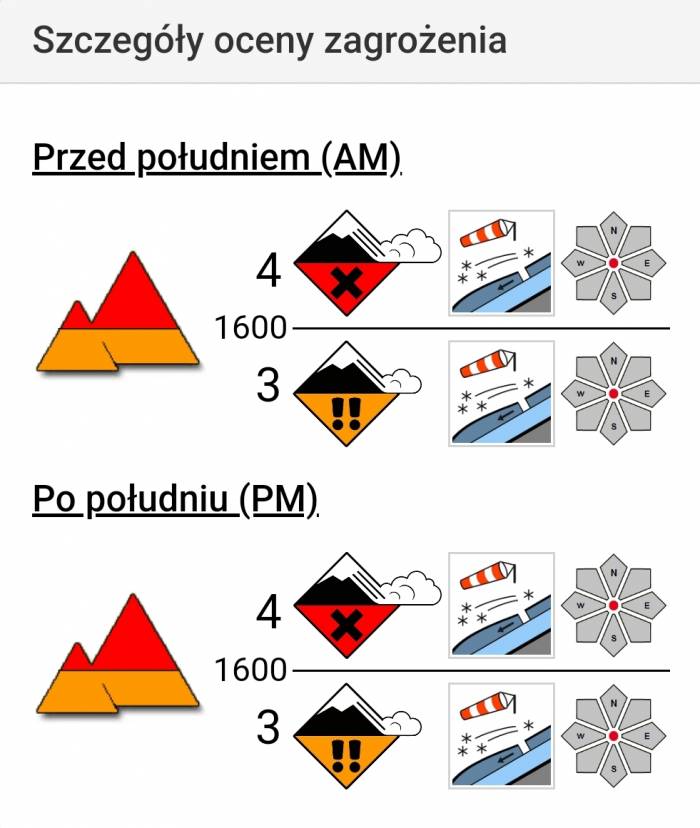 Warunki zdecydowanie niekorzystne. Zaleca się zaniechanie wszelkich wyjść w teren wysokogórski. Należy pozostawać w granicach umiarkowanie stromych stoków oraz brać pod uwagę zasięg lawin z wyżej położonych stoków.