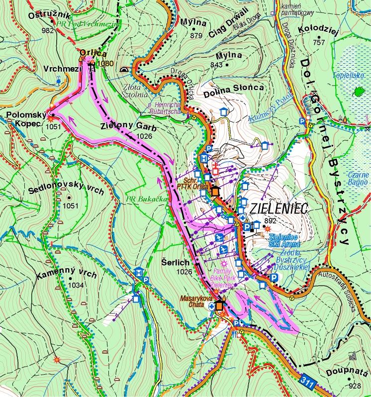 Z Masarykovej Chaty roztacza się piękny widok na okolicę. Tu znajduje się również turystyczne przejście polsko-czeskie. Zresztą dalsza część trasy wiedzie wzdłuż granicy z lekkimi odchyleniami do naszych południowych sąsiadów. Masarykova Chata jest także świetnym miejscem na odpoczynek z doskonałą kuchnią oraz lokalnymi czeskimi przysmakami. Biorąc jednak pod uwagę, że to dopiero początek treningu skupmy się na dalszej drodze. A ta prowadzi w kierunku wieży widokowej na Orlicy.