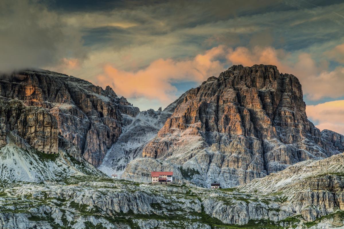 Budynek schroniska Tre Cime A. Locatelli (2450 m n.;p.m.), bo tak brzmi jego pełna nazwa, idealne wpisuje się w okolicę. To właśnie z tej perspektywy Tre Cime prezentują się w klasycznej odsłonie. Trzy potężne „zęby” wyrastają z ziemi ku niebu. Dotarcie do tego miejsca nawet niewprawionym turystom nie przysporzy problemów. Choć z ciężkim plecakiem droga zajęła mi około trzech godzin. Łatwo obliczyć, że z odpoczynkiem i podziwianiem widoków całą pętla zajmie nam około ośmiu godzin. Ale warto zdecydować się tu na nocleg, żeby w pełnej krasie zobaczyć je o zachodzie słońca i porozmawiać z turystami, którzy przyjeżdżają tu z całego świata.