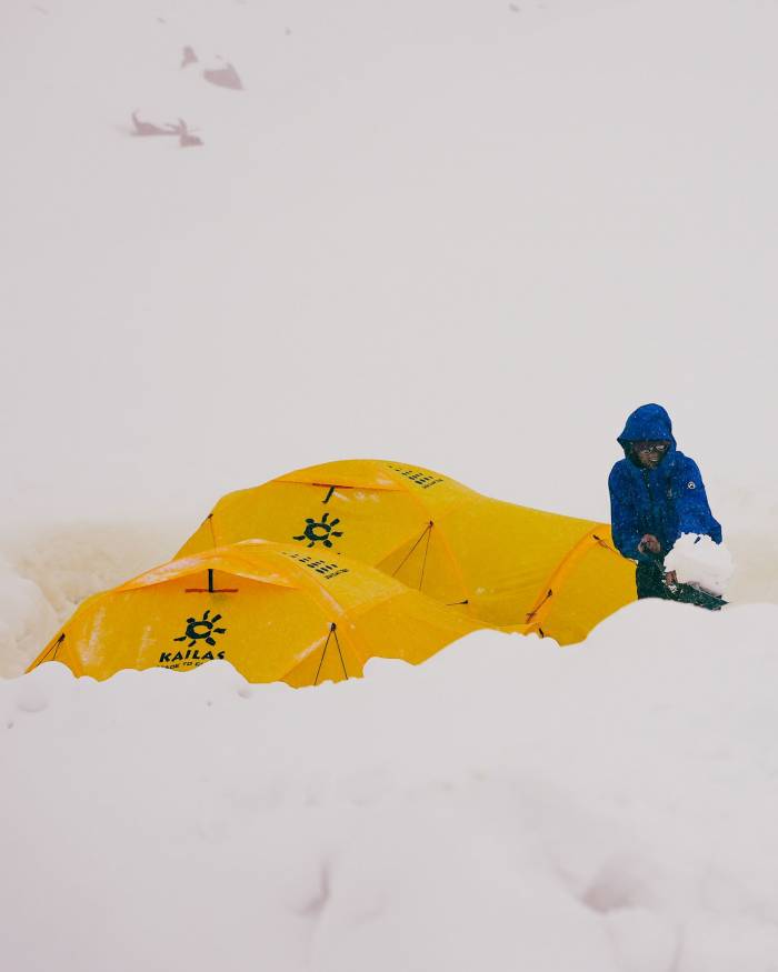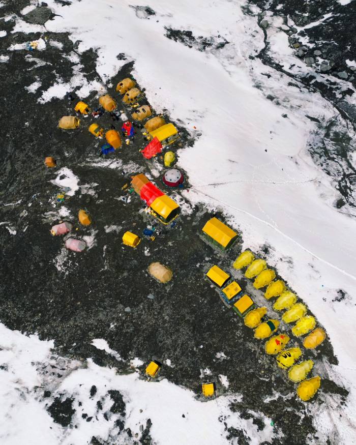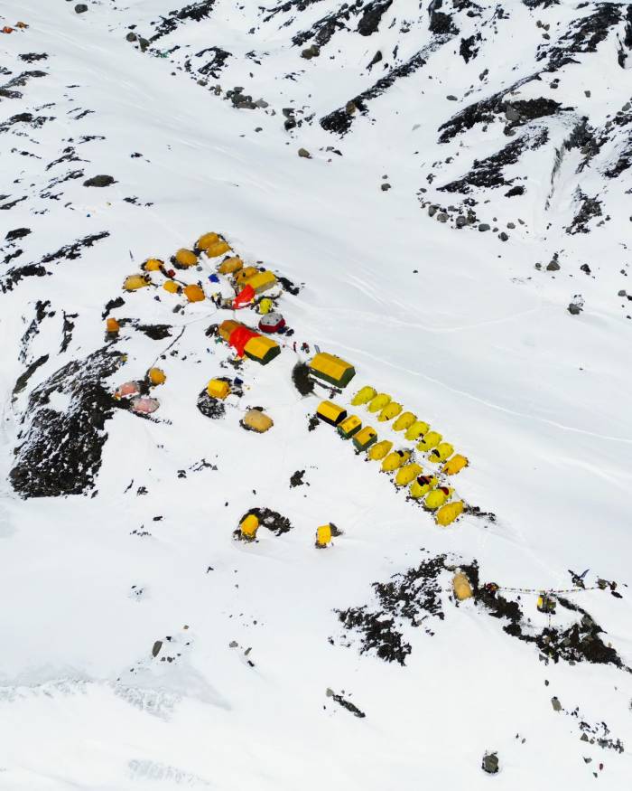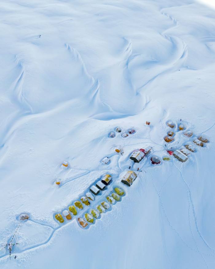 Przez ostatnie dni na bazę pod tym ośmiotysięcznikiem łącznie spadły blisko 2 metry śniegu. Zdjęcia z drona ilustrują, jak zmieniała się sytuacja przez ostatnie dwa tygodnie (fotografie odpowiednio z 19, 23 kwietnia i z poranka 5 maja).