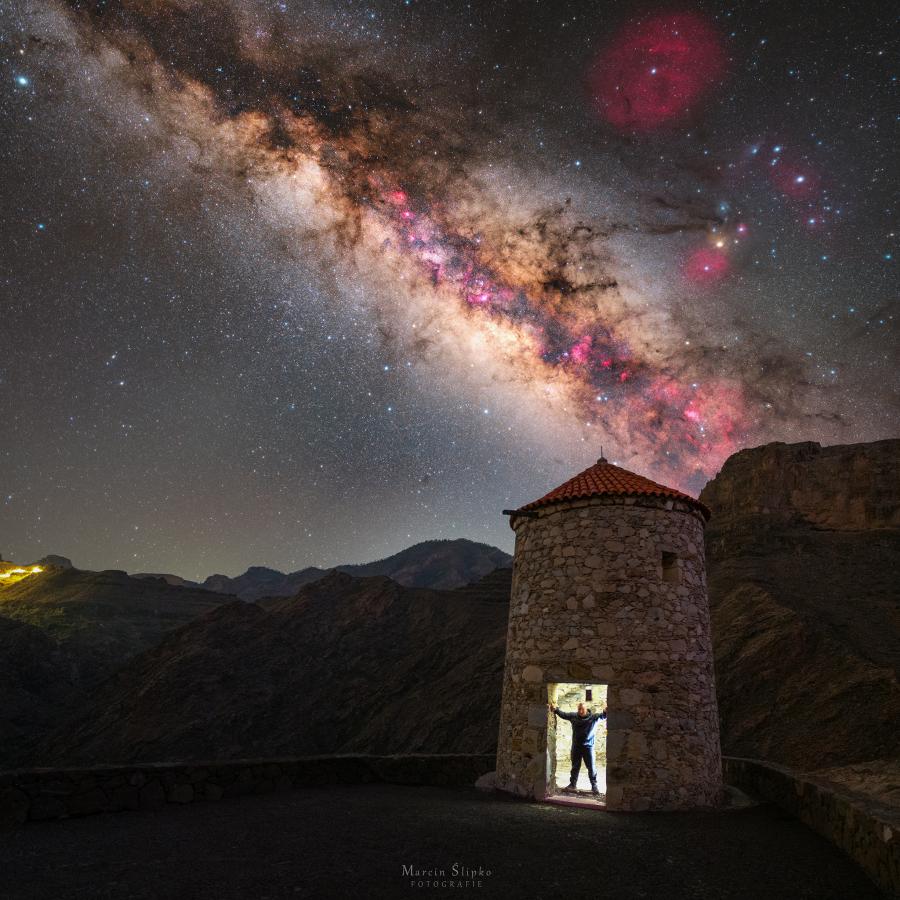 Zamieszkaliśmy w górskich jaskiniach zaadaptowanych na agroturystykę w miejscowości Hoya Pineda, która stanowi północną bramę do gór Gran Canarii. Właśnie stąd prawie każdej nocy wyruszaliśmy bardziej na południe, w centralną część wyspy na astro-foty. Okazało się, że niebo jest tu niemal czyste, a chmury wręcz "opierają” się o północne wybrzeże. Ale to nie wszystko - wysokość na jakiej fotografowaliśmy, czyli 1200-1600 m n.p.m. oraz bardzo niska wilgotność powietrza okazały się naszym sprzymierzeńcem i światła miast praktycznie nam nie przeszkadzały. Były widoczne w bardzo małym stopniu, prawie nie mając wpływu na zdjęcia.