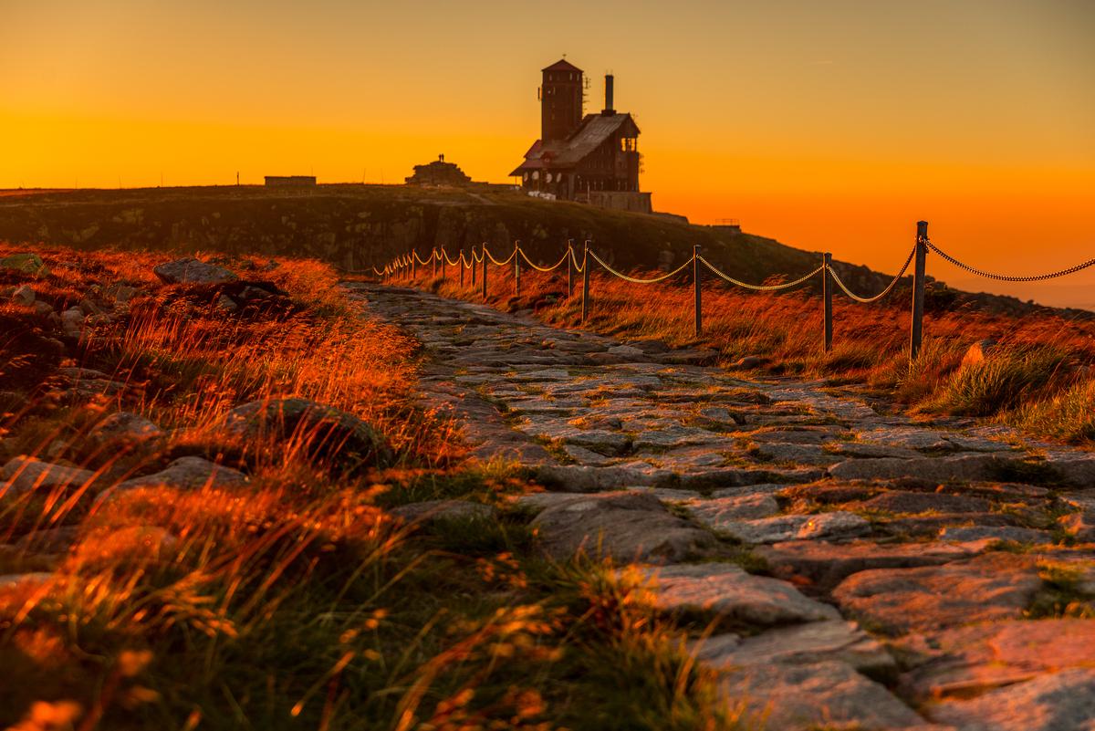 Za budynkiem znajduje się rozwidlenie dróg. Idąc w lewo zielonym szlakiem można krótszą drogą dojść do Karpacza. Wybieramy jednak dłuższy wariant biegnący dalej grzbietem Karkonoszy w kierunku Śnieżki wzdłuż czerwonych oznakowań. Wijącą się nieznacznie - to w górę to w dół - ścieżką idziemy wśród żółknących traw. Po lewej stronie rozpościera się zachwycający widok na kotlinę, wobec którego nie da się przejść obojętnie.